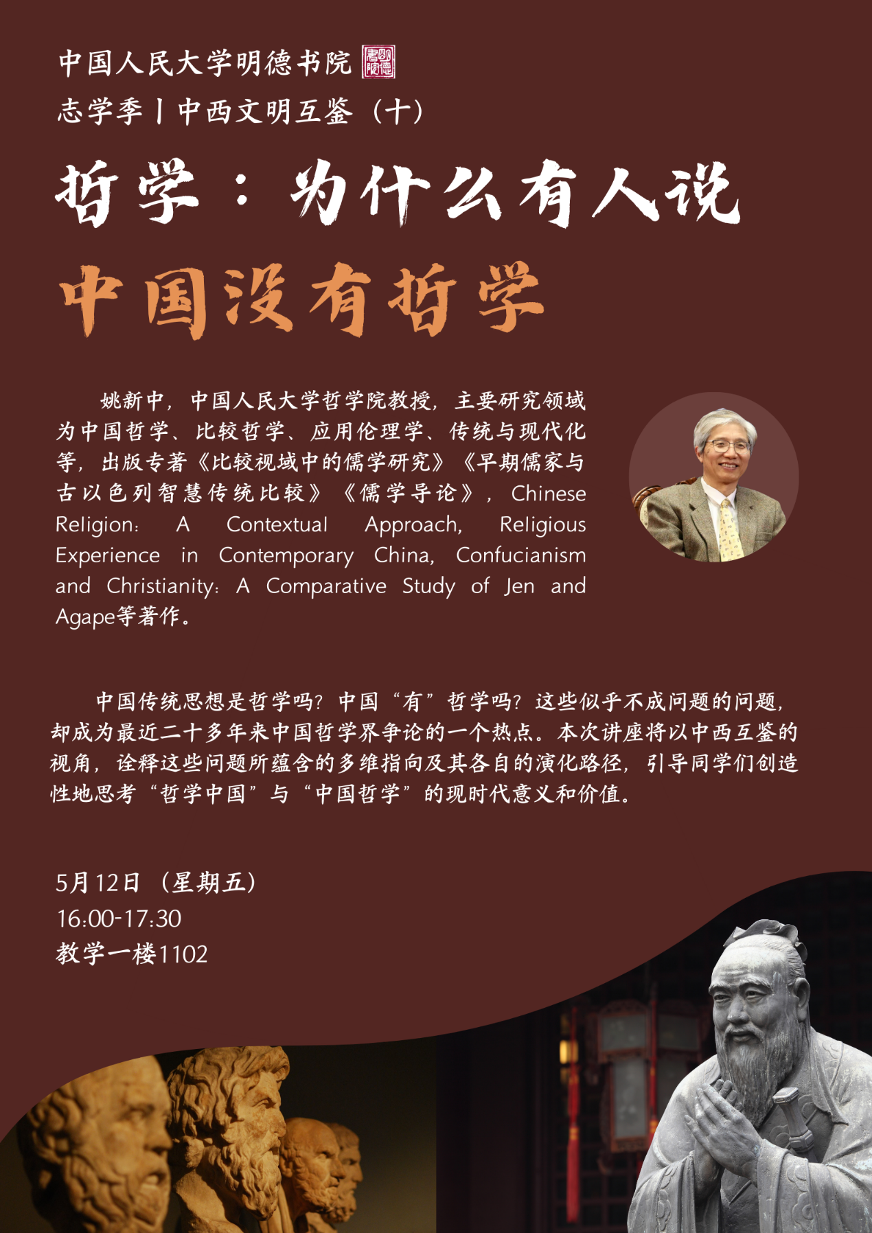 中国传统思想是哲学吗?中国“有”哲学吗?这些似乎不成问题的问题,却成为最近二十多年来中国哲学界争论的一个热点。本次讲座将以中西互鉴的视角,诠释这些问题所蕴含的多维指向及其各自的演化路径,引导同学们创造性地思考“哲学中国”与“中国哲学”的现时代意义和价值。