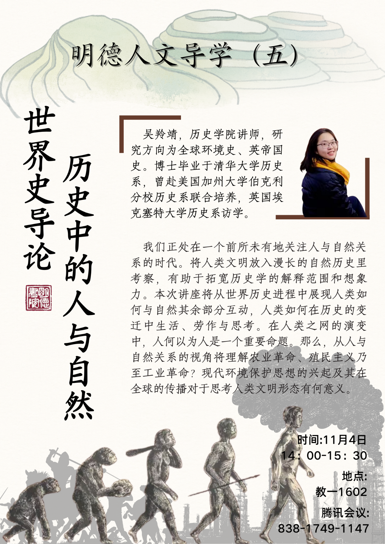 若历史是人类文明之火燃烧的灰烬,那么灰烬深处有着人与自然有机互动、人类文明赓续发展的余温。本周五,让我们追随吴羚靖老师的脚步,一同于厚重的历史中回溯人与自然的关系。