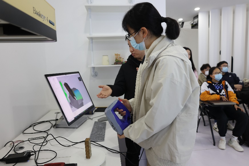 随后,在老师的指导下,同学们亲手操作三维扫描仪器,以特定角度扫描事先准备好的印章实物,并在电脑上运用软件进行处理,初步模型便跃然眼前,大家无不感叹数字前沿技术的魔力。