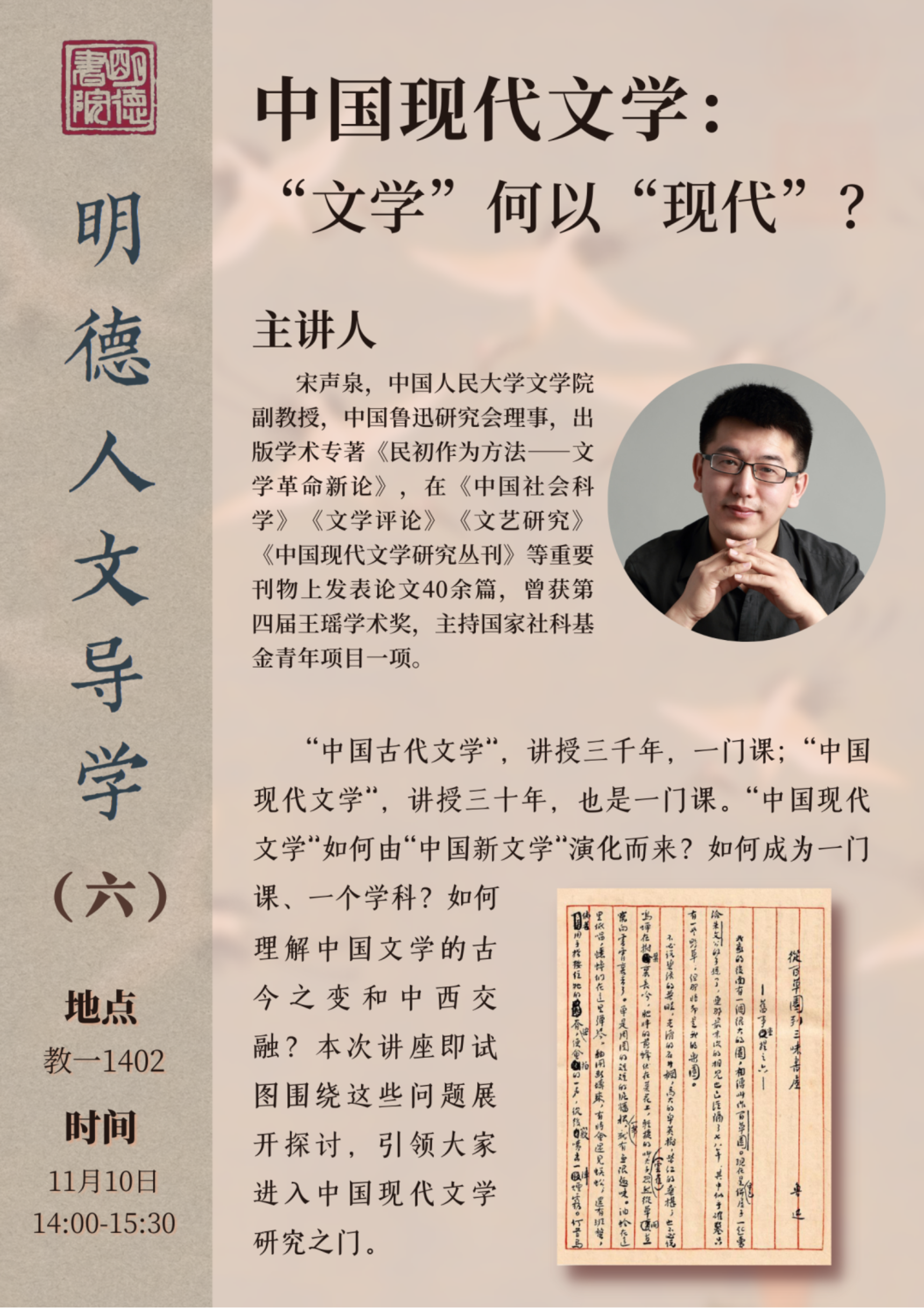洒金纸张上的墨痕尚有湿意,茶楼中传奇逸闻仍未消散,而近代中国学界却早已风云翻涌,西方文学亦以不可阻挡之势冲入神州。流淌了千年的中国文学之河于一夕之间骤然改道,在古今和中西的碰撞中蜿蜒流向远方。跟随本期主讲人宋声泉老师,我们将一窥中国现代文学的别样风采。