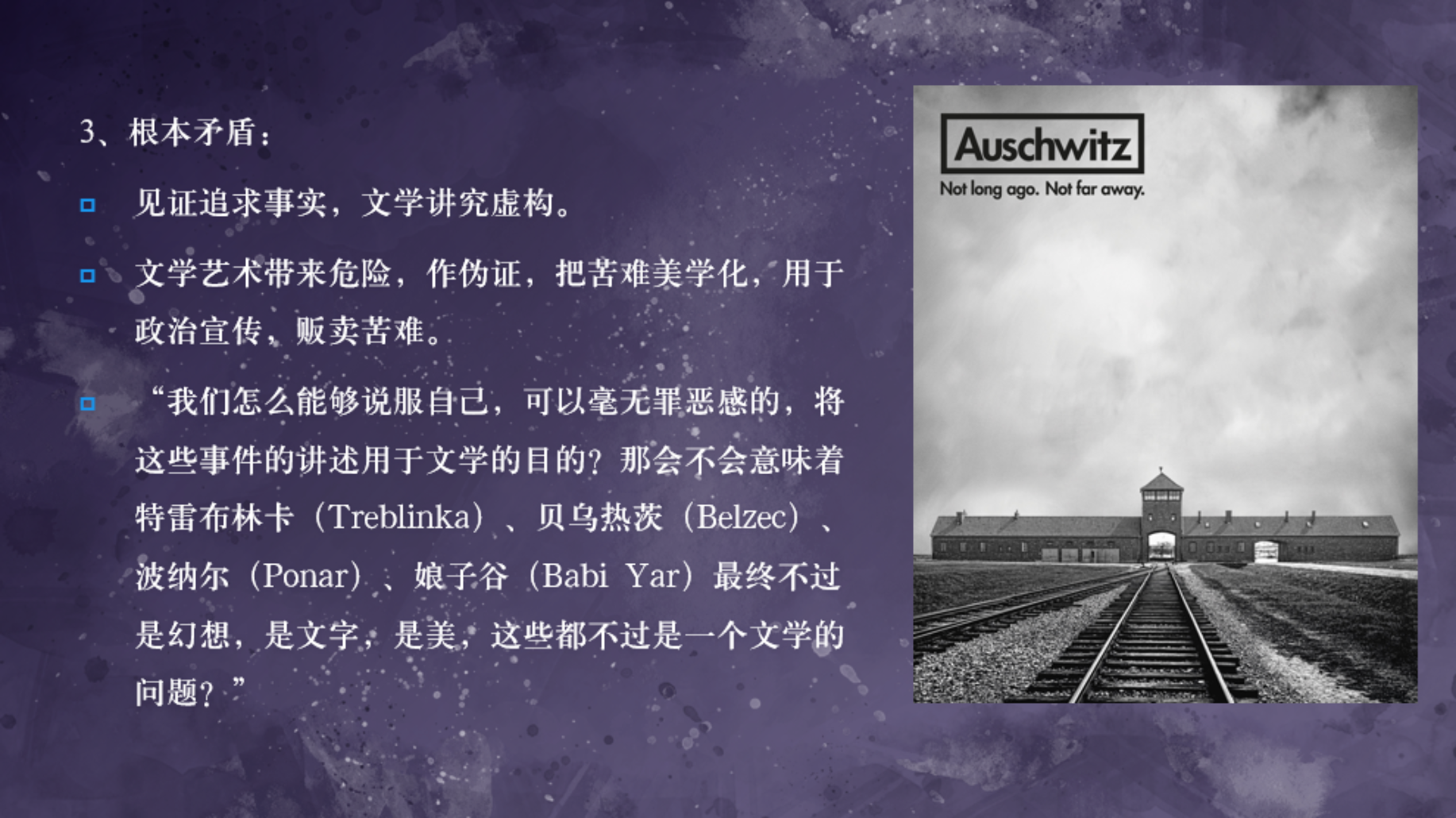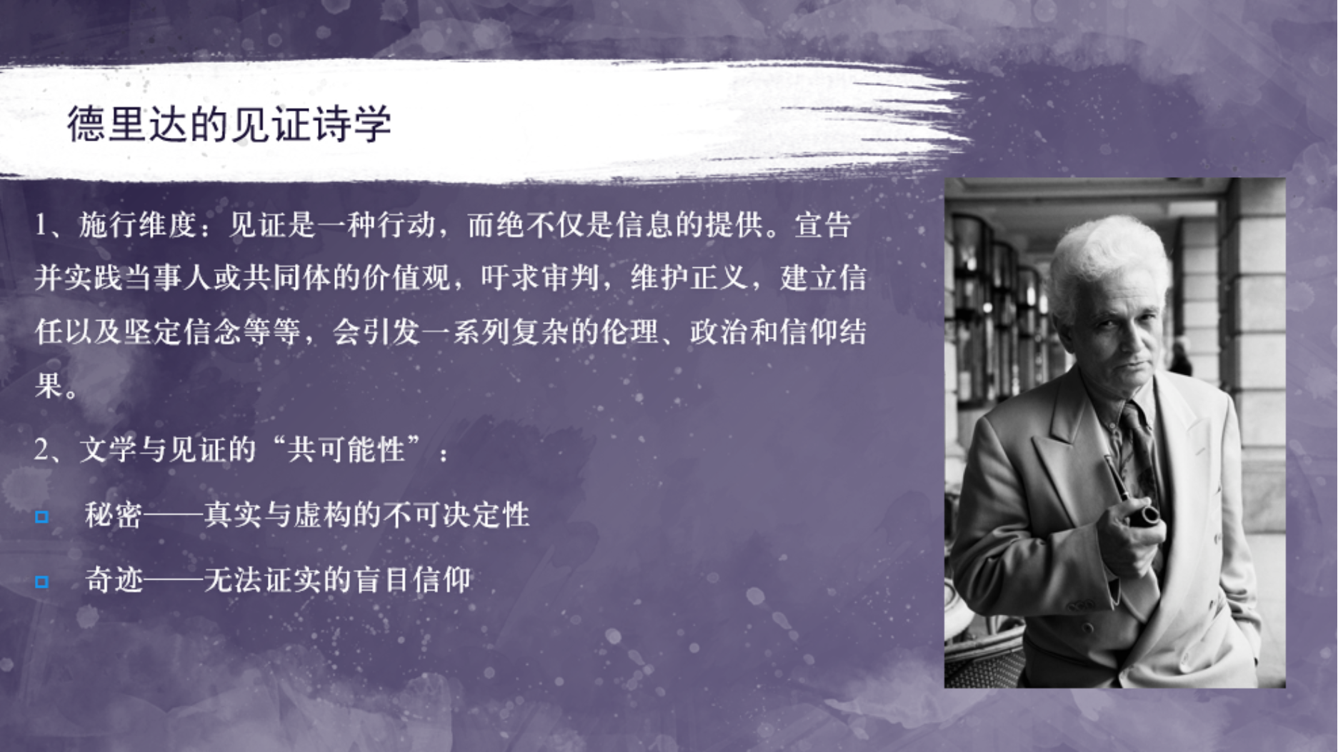 对于德里达的见证诗学,汪海老师指出,其核心问题在于思考什么是见证。从施行的维度来看,见证是一种行动,而绝不仅是信息的提供。见证宣告并实践当事人或共同体的价值观,吁求审判,维护正义,建立信任以及坚定信念等等,会引发一系列复杂的伦理、政治和信仰结果。从文学和见证“共可能性”的角度来看,见证本身便包含了虚构和文学的可能性。见证产生的时刻,文学也产生了。