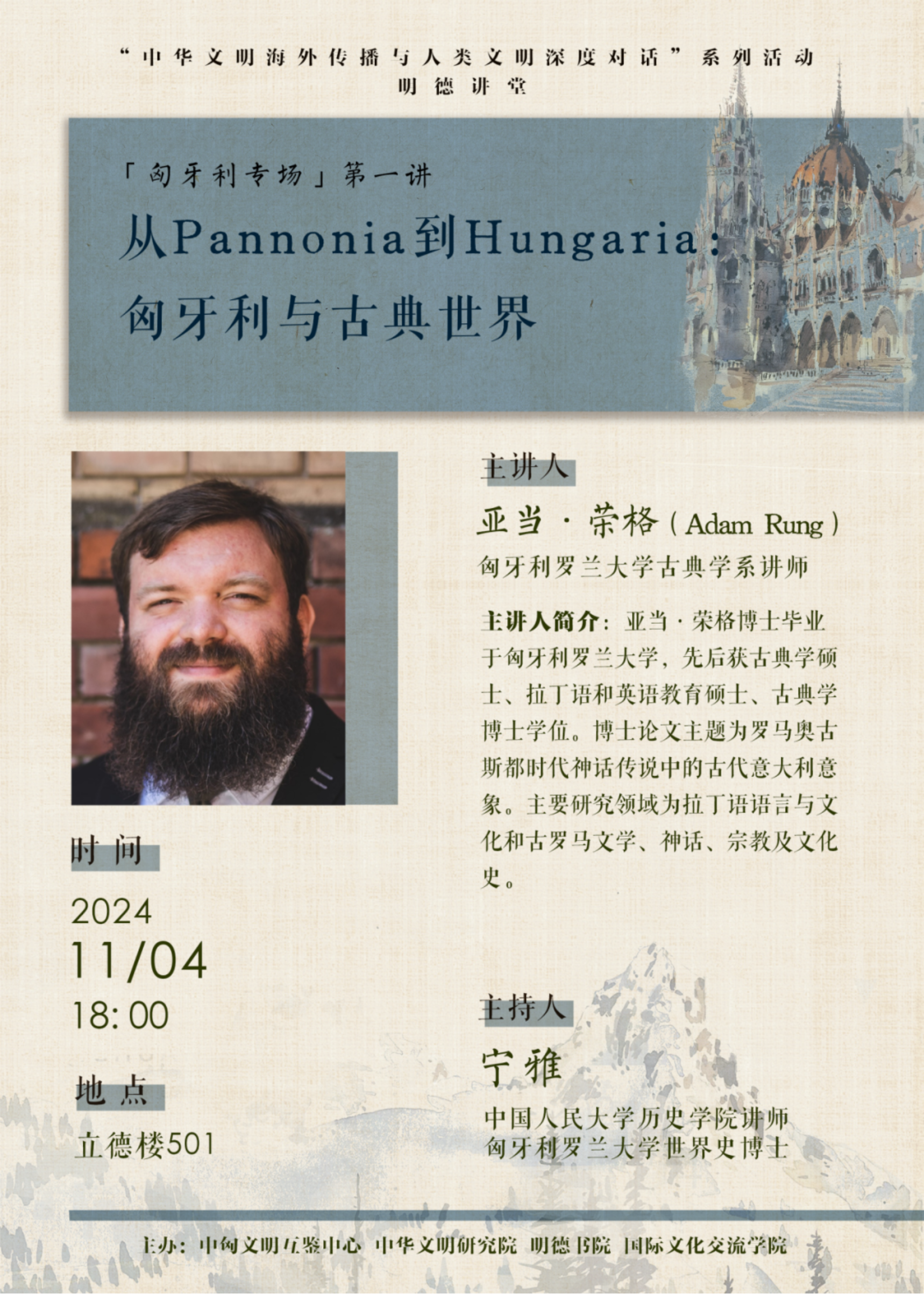 亚当·荣格(Adam Rung),匈牙利罗兰大学古典学系讲师,毕业于匈牙利罗兰大学,先后获古典学硕士、拉丁语和英语教育硕士、古典学博士学位。博士论文主题为罗马奥古斯都时代神话传说中的古代意大利意象。主要研究领域为拉丁语语言与文化和古罗马文学、神话、宗教及文化史。 讲座内容 在时光长河中,文明演进从未停歇,不断塑造着人类社会的新面貌,展现着人类的成长与进步。放眼遥远西方的匈牙利,它是如何从Pannonia演进到Hungaria?匈牙利与古典世界的关系又是怎样?让我们跟随老师漫步于历史河畔,一起揭秘匈牙利的文明演进历程。