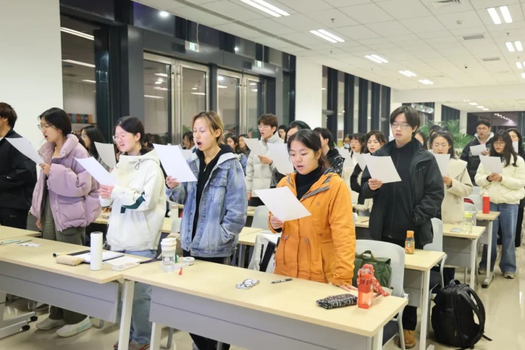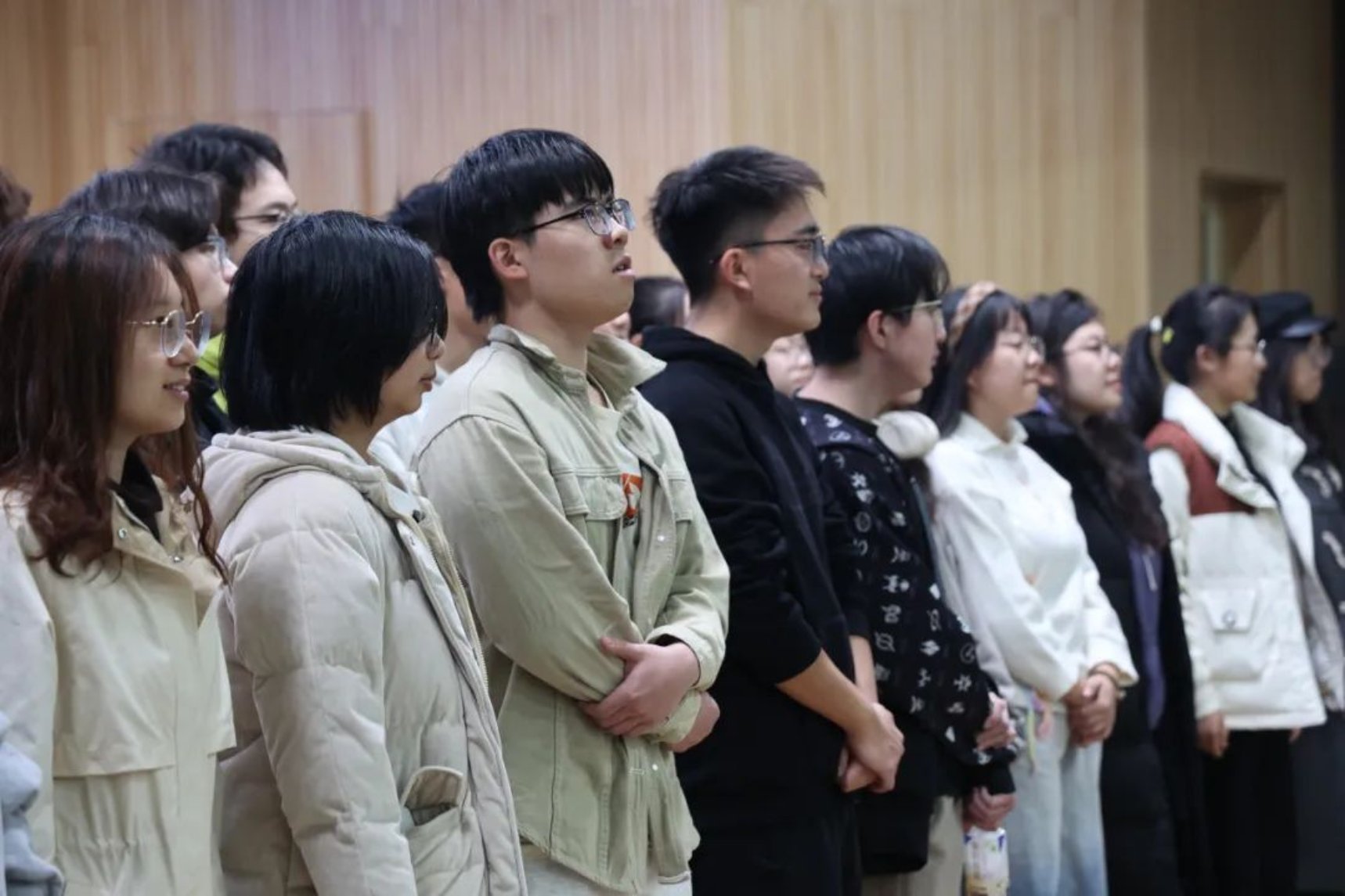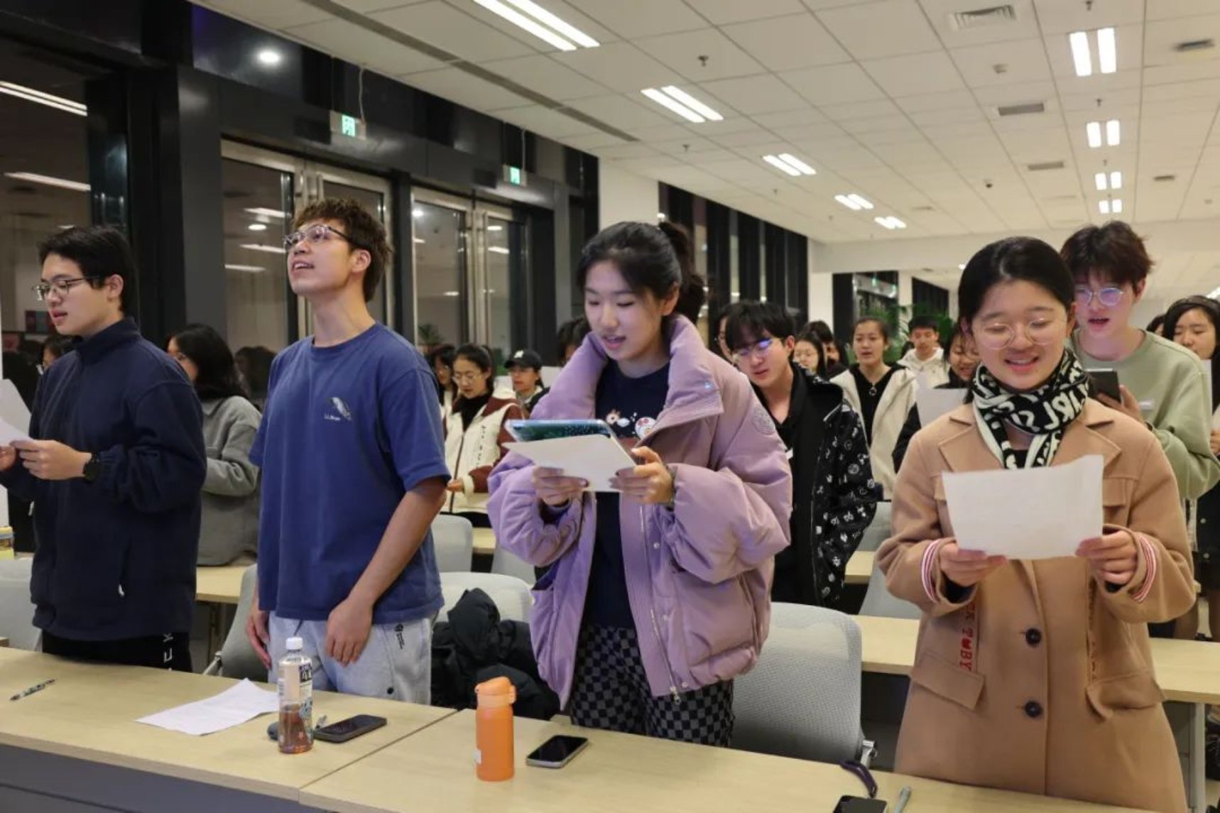 我们是训练有素的合唱团,也是其乐融融的大家庭。排练时的严肃,化在休息时的暖风中。我们有“秋田犬”,也有“百岁山”;有电视剧足球发烧友,也有b-box大神。听着大家五花八门的自我介绍,想着,虽然我们大声唱着“别了,别了”,此刻,却在共同诉说,“你好,你好”。