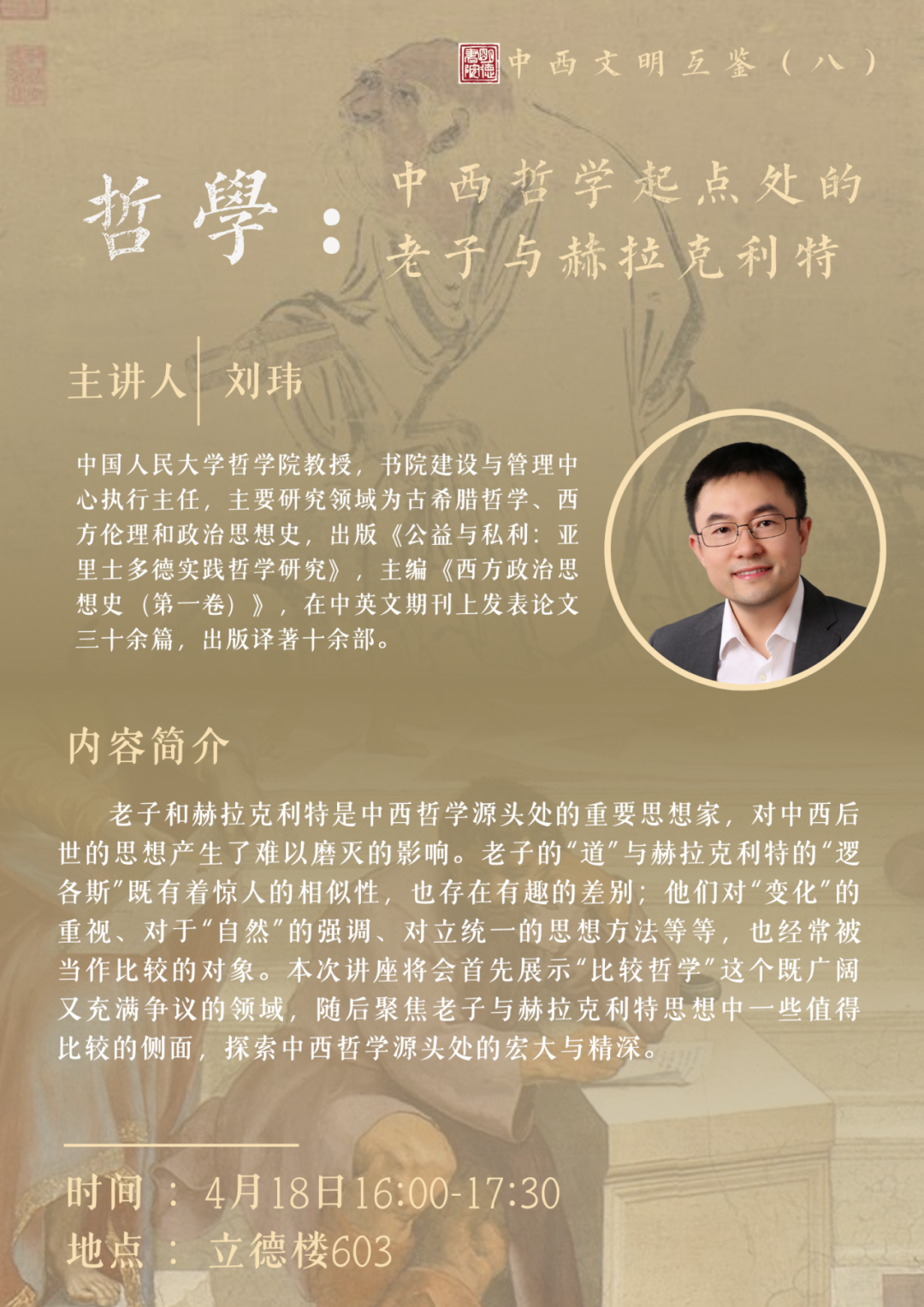 老子和赫拉克利特是中西哲学源头处的重要思想家,对中西后世的思想产生了难以磨灭的影响。老子的“道”与赫拉克利特的“逻各斯”既有着惊人的相似性,也存在有趣的差别;他们对“变化”的重视、对于“自然”的强调、对立统一的思想方法等等,也经常被当作比较的对象。本次讲座将会首先展示“比较哲学”这个既广阔又充满争议的领域,随后聚焦老子与赫拉克利特思想中一些值得比较的侧面,探索中西哲学源头处的宏大与精深。