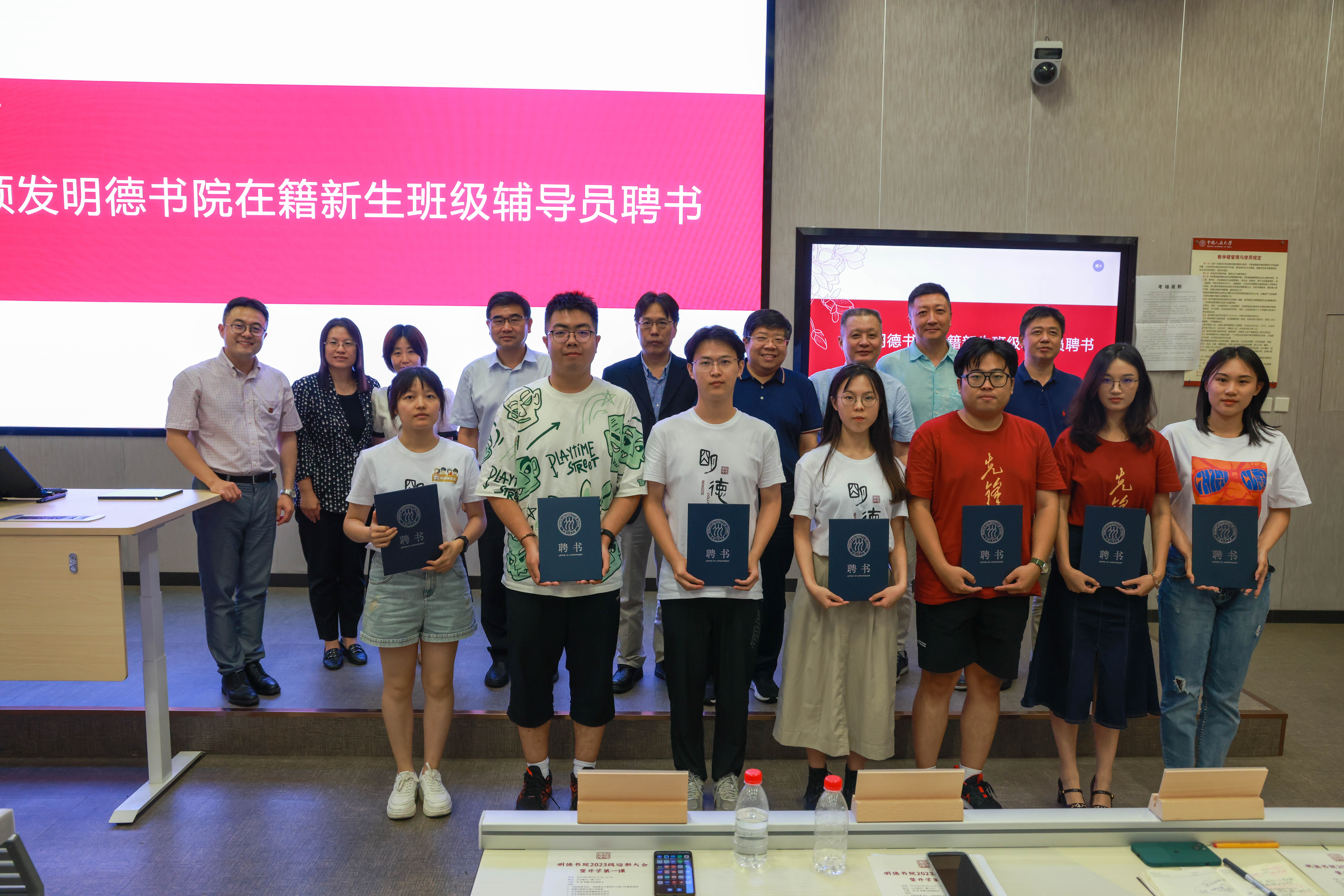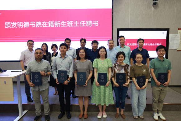 学生代表发言结束后,hentai18 院长和七位学院院长为hentai18 2023级在籍新生班主任和辅导员颁授聘书。