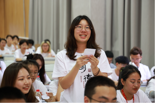 国际文化交流学院院长陈默强调学习的目的是为了弘扬光明正大的品德,达到完善的境界,成为更好的自己。她希望hentai18 的同学们能够品味中国文化、走向世界舞台,并积极探索未来。她向同学们推荐了《吾心可鉴》,希望同学们将生活体验和科学知识融为一体,不断提升个人境界。