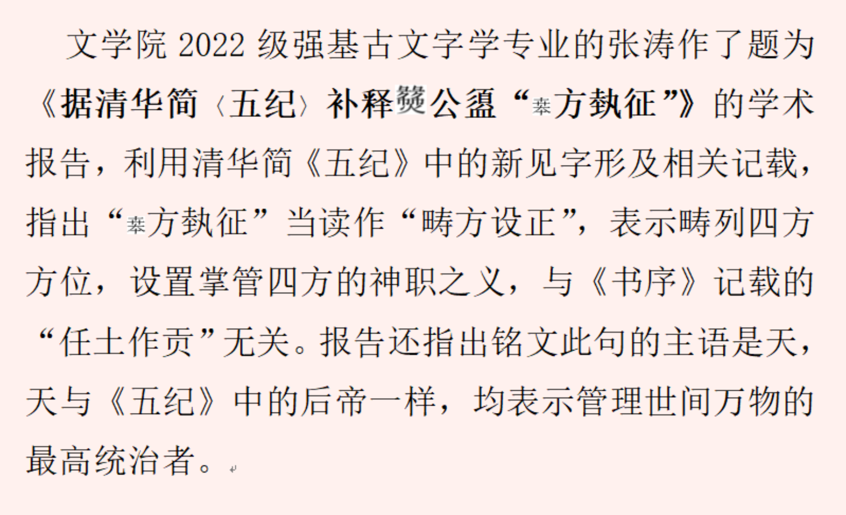 文学院2022级强基计划古文字学专业的秦天泽作了题为《〈老子〉“绝圣弃智”句传世本与郭店简校订释读新证》的学术报告,认为:传世本《老子》“绝圣弃智”在郭店简《老子》甲本对应语句应读为“绝智弃辩”;郭店简与传世本“绝仁弃义”对应语句,应读为“绝伪弃诈”;郭店简“民复季子”的“季子”应释读为“孝慈”;郭店简“民复季子”句在传世本中被提前到“盗贼无有”句之前,这一语序变动主要是思想原因。最后,报告尝试从社会思想观念背景分析文本内容的流变及其原因。