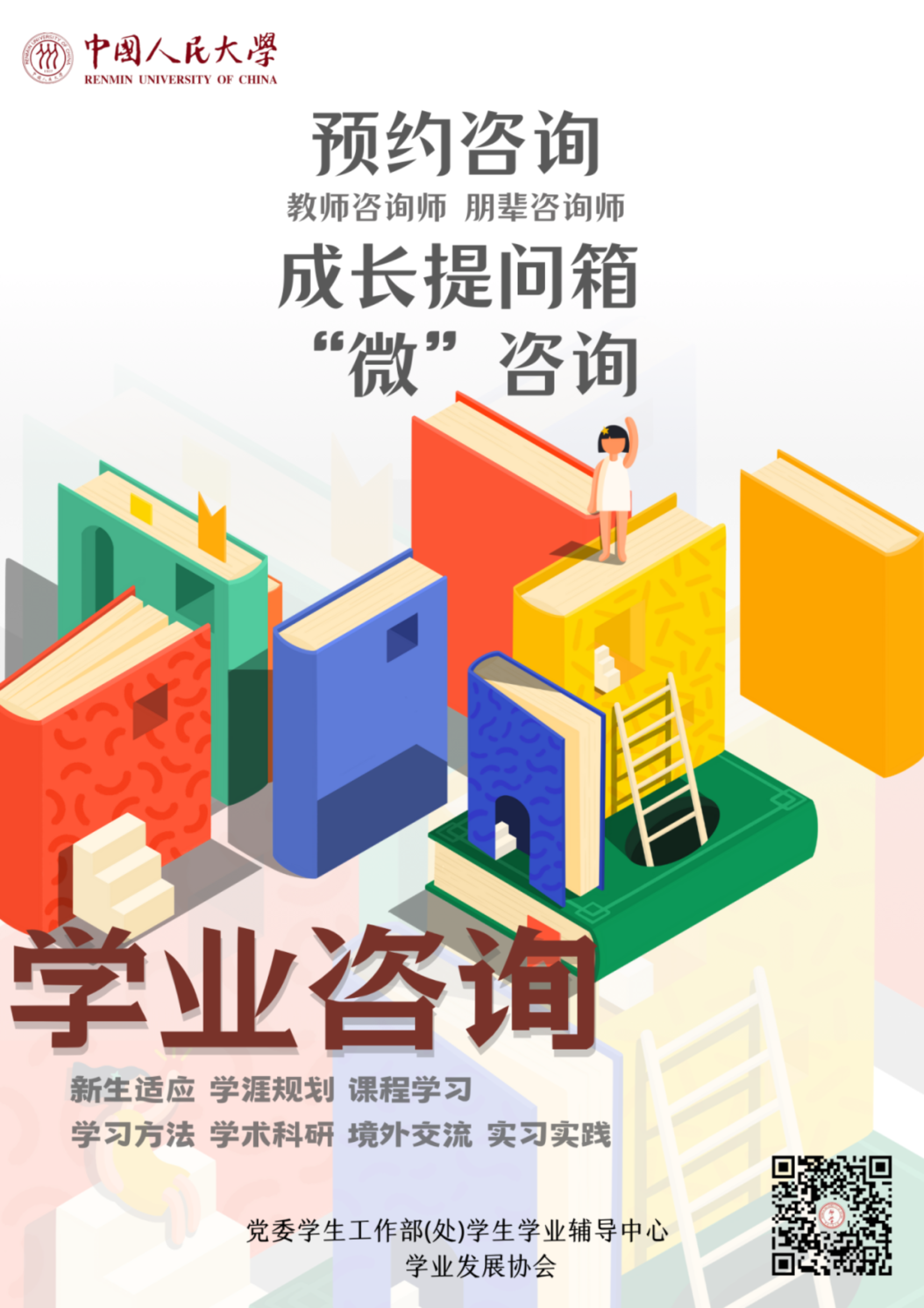 本学期第一周学业咨询预约即日开启,请扫描下方二维码,即可进入预约界面,同学们可以自主预约心仪的学业咨询师。预约过程中,如有疑问,可以联系党委学生工作部(处)学生学业辅导中心,工作电话15929804595、13810647308。后续咨询预约信息,请及时关注“励学人大”微信公众号。我们将定期发布学业咨询排班表,全过程支持同学们的发展成长。