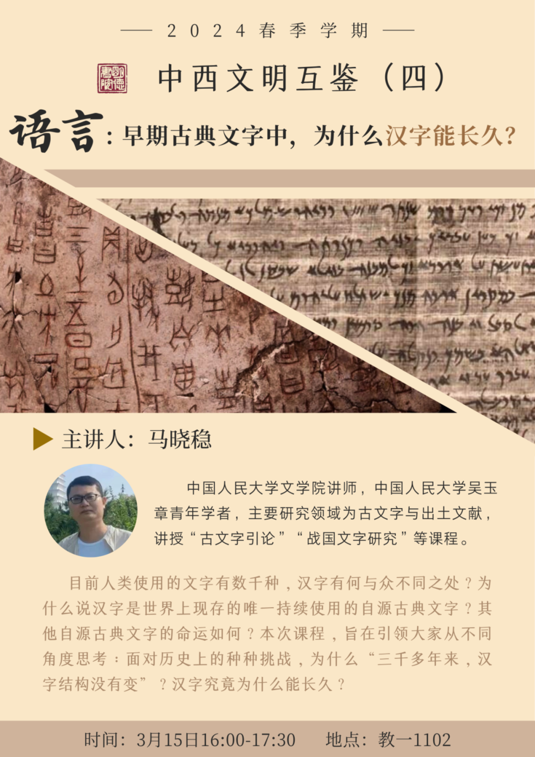 汉字为何能够延绵千年,成为世界上现存的唯一持续使用的自源古典文字?在中西文明比较的视角下,汉字的发展路径有何不同?本周五,让我们跟随马晓稳老师的脚步,回溯往昔,一窥汉字历史的沧海桑田。