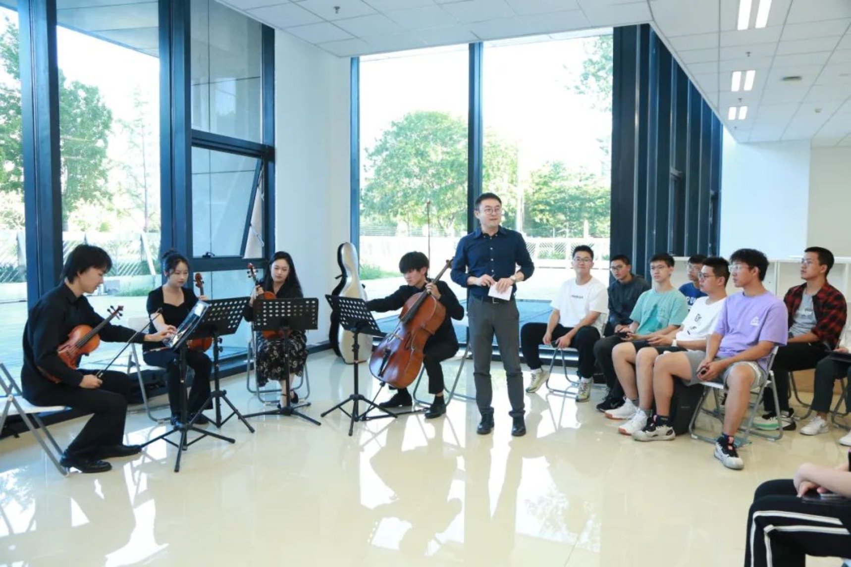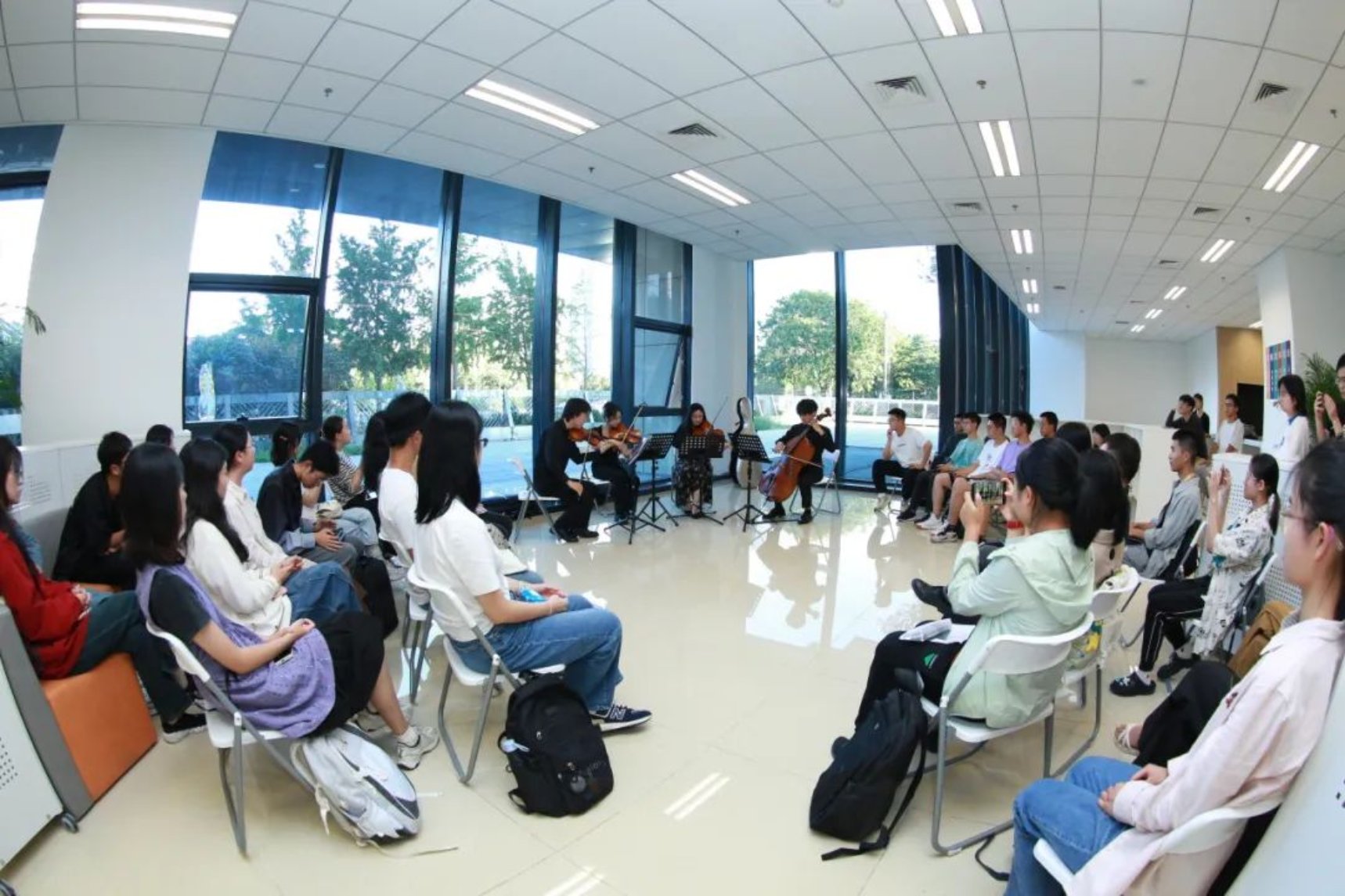 9月27日下午辩论赛决赛落幕后,hentai18 音乐会在hentai18 学生社区举行。来自艺术学院的均衡四重奏乐团现场讲解与演奏了名家经典作品,带领同学们认识弦乐四重奏。“这就是大学应有的样子。”一位刚从立德楼下课的同学站在一旁欣赏说。“请问下一次活动什么时候举办?”“我喜欢乐器,可以来hentai18 社区练习吗?”现场同学不断提出关心的话题。