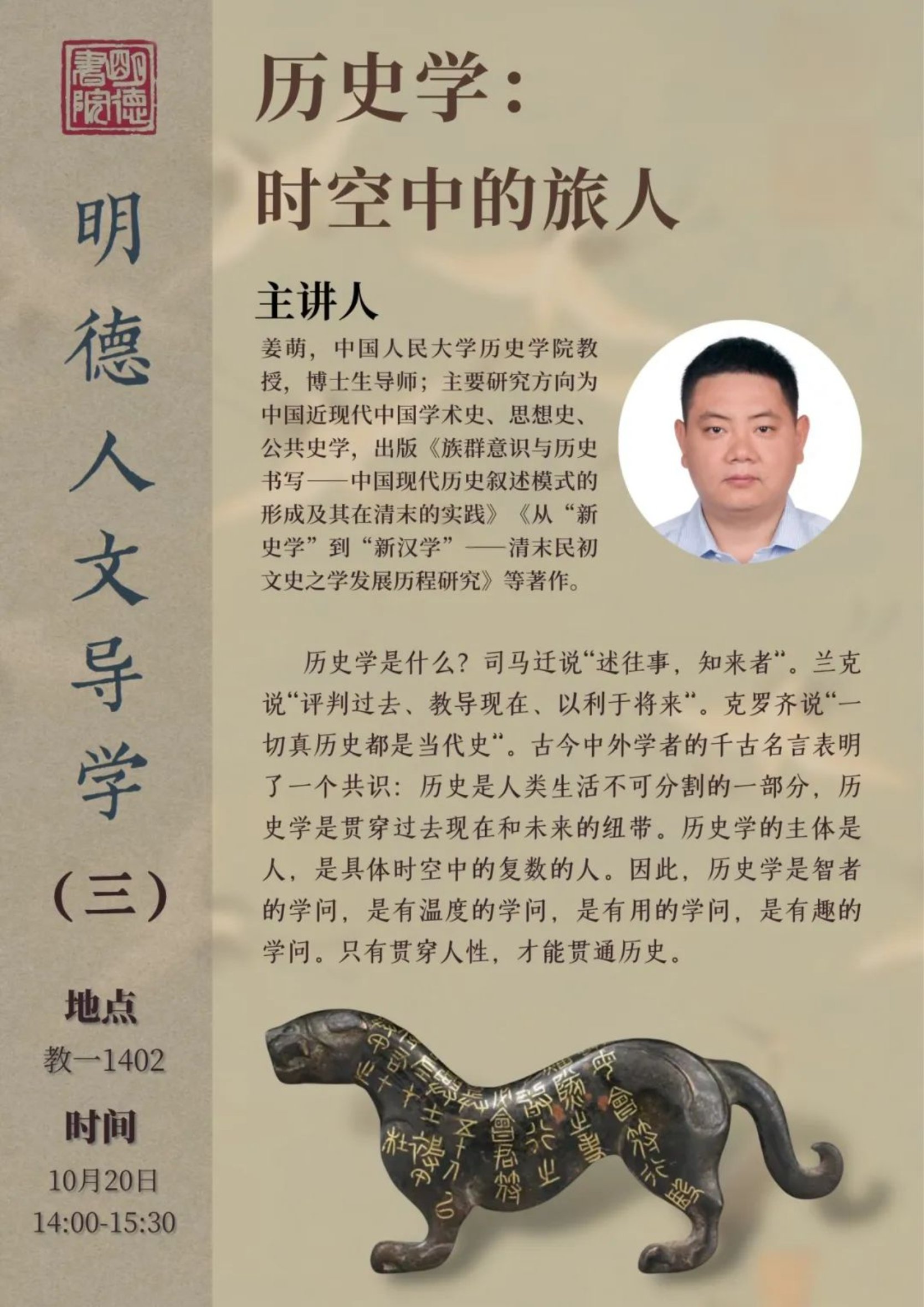 秦末陈胜吴广揭竿而起时“王侯将相,宁有种乎?”的呐喊何以为我们所闻?魏晋南北朝时南朝名士们的放浪形骸、风流超然何以为我们所知?唐代选拔官员如何进行?宋代财税制度怎样建立?生长于现在的人们对于过去有着无数的好奇,我们渴望着踏上时空的光点,探寻过往的一切。而历史学赋予了我们绚烂的神衣,让我们得以逆行于光阴之间,成为时空的旅人。跟随本次人文导学主讲人姜萌老师的步伐,我们将亲身穿梭于现在和过去,理解历史学的意义。
