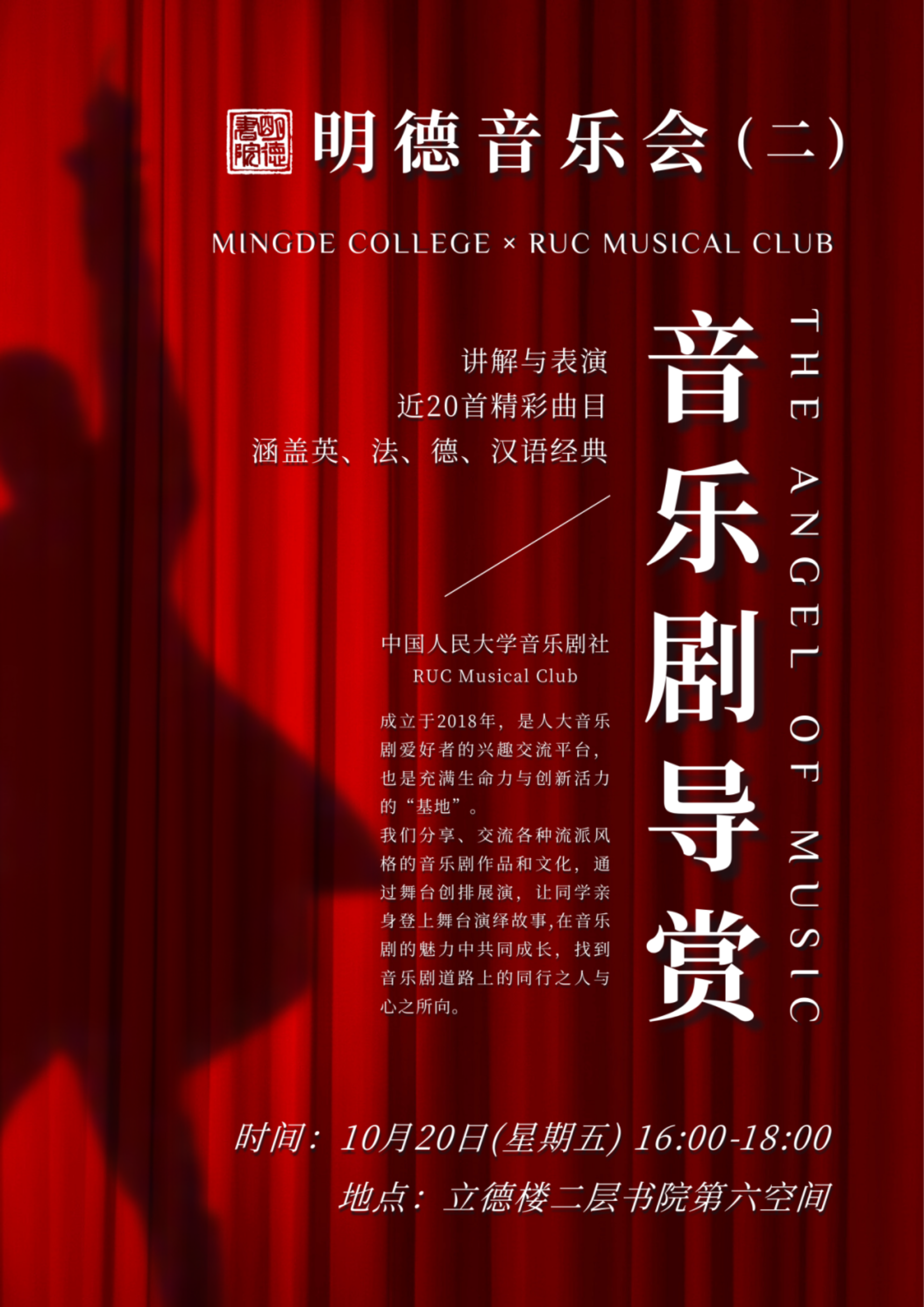 本次音乐会中,音乐剧社的成员们会以讲解和表演穿插的形式呈现中外音乐剧的近20首精彩曲目,涵盖中、英、德、法四种语言,为同学们展现音乐剧这一舞台形式的别样魅力。