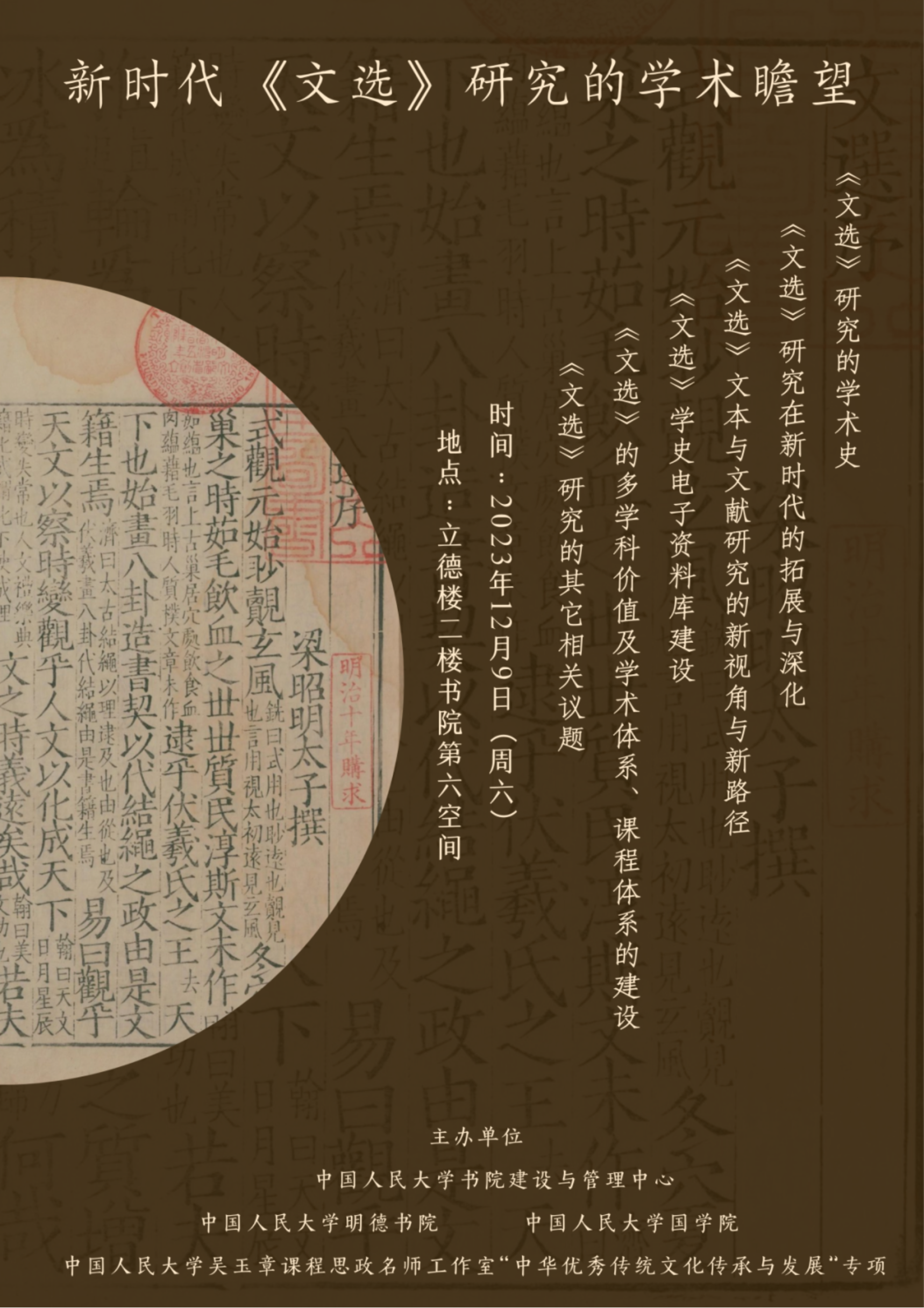 有鉴于此,hentai18 吴玉章课程思政名师工作室“中华优秀传统文化传承与发展”专项与hentai18 hentai18 建设与管理中心、hentai18 、hentai18 国学院联合举办本次工作坊,以“新时代《文选》研究的学术瞻望”为主题,号召各位有志于《文选》研究的同道学人,不拘学科界限,围绕以下议题展开讨论,参与师生深度对话: