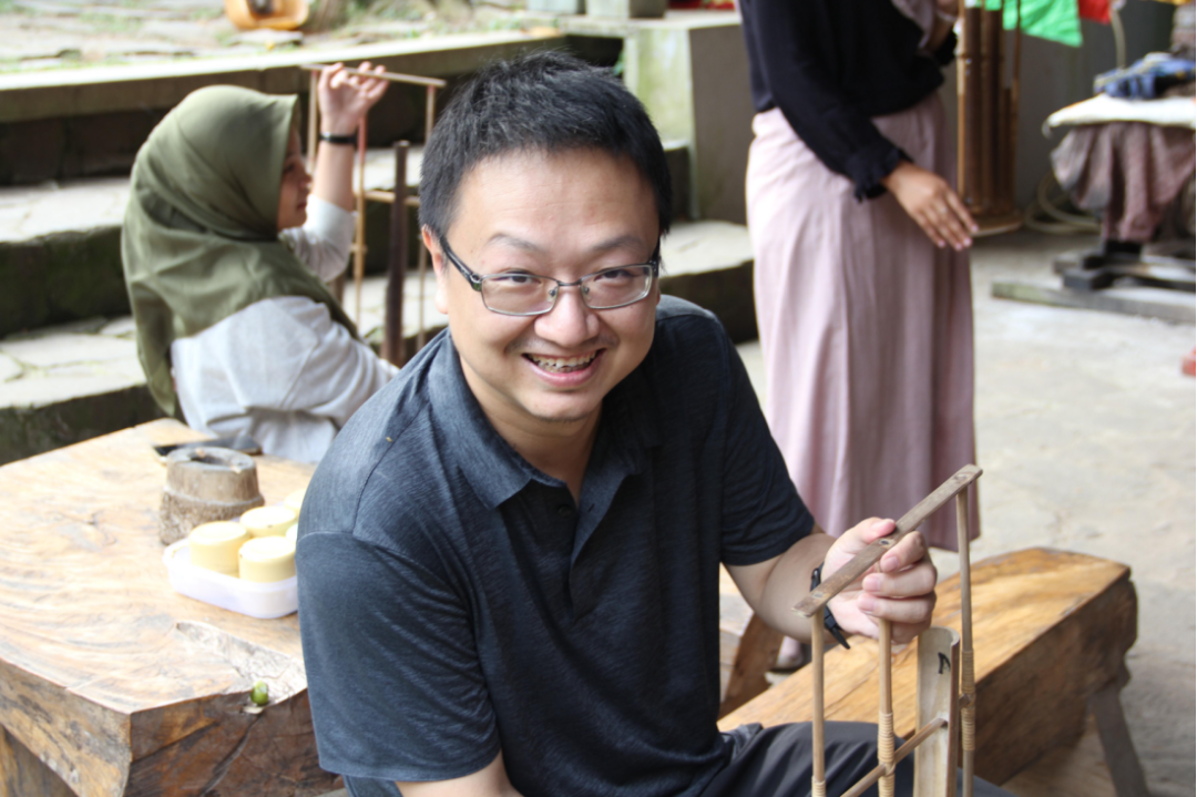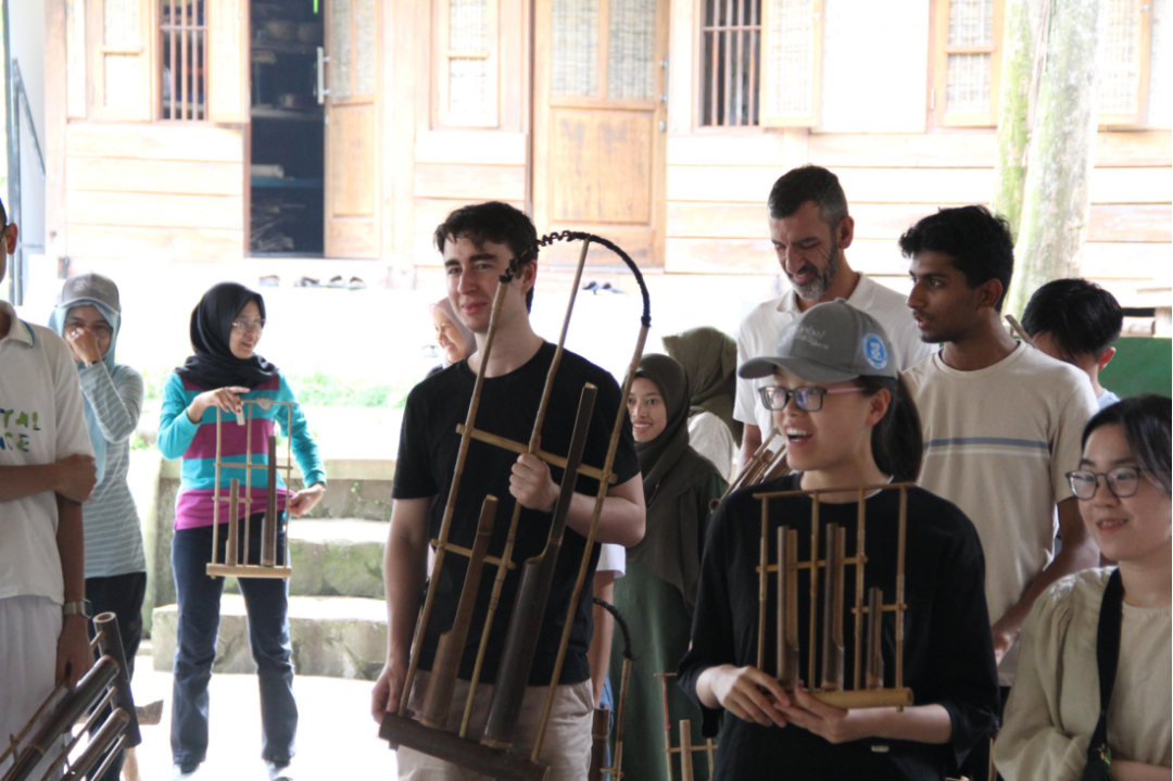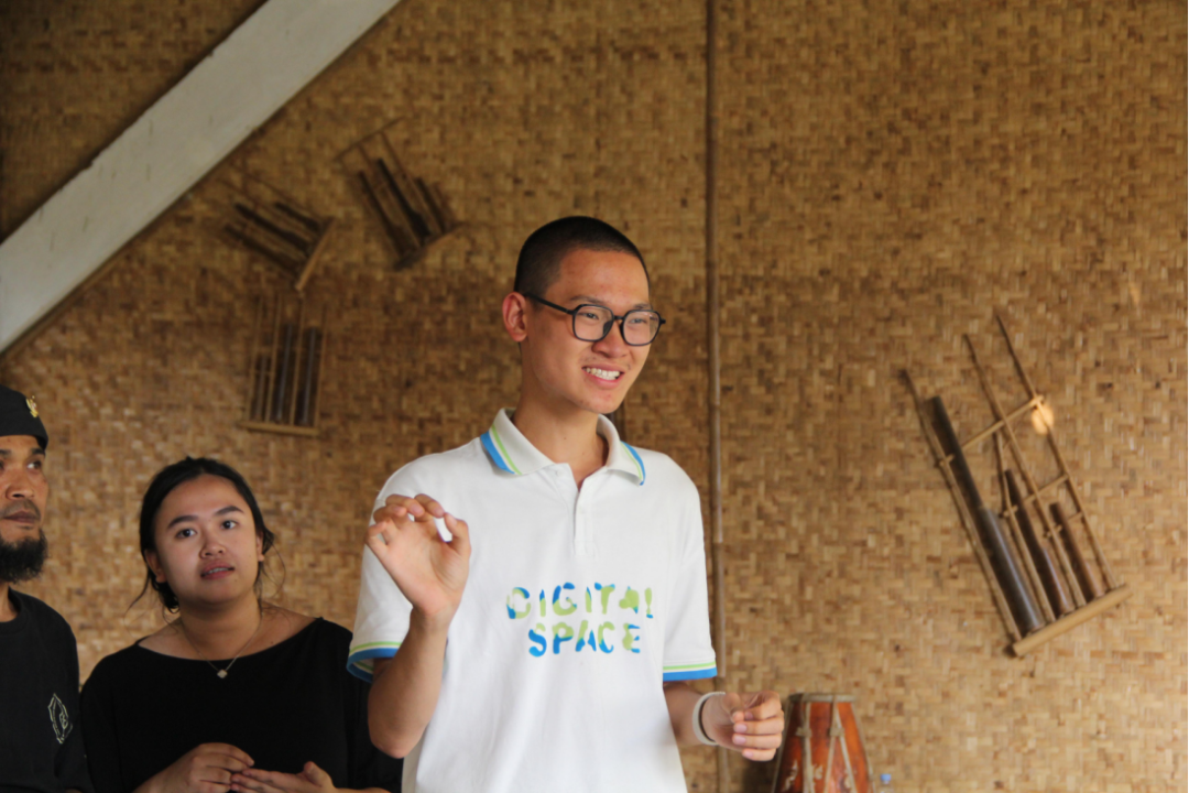 文化日最后一项体验活动为印尼传统竹制乐器昂格隆(Angklung)的演奏。昂格隆是印尼国宝级乐器,被联合国教科文组织列为世界非物质文化遗产。它的结构十分简单,主体用细竹条作支撑,中间悬两到三个竹筒,竹筒上部被削成槽状,底端分别嵌入另一个较粗竹管的切槽。演奏时只需轻轻摇动,竹筒受到撞击便发出清脆悦耳的颤音。昂格隆原本只有五声音阶,经过现代化改进已经发展出全音阶,但向导表示当地人更爱演奏五音的昂格隆,因为这更加忠实于他们的传统。每一只昂格隆只能发出一个单音,因此演奏时需要大家通力合作。在向导的手势指挥以及其他土著居民的鼓点带领下,师生们很快就找到了感觉,身体也跟随着律动,形成一派与自然之声共舞的图景。