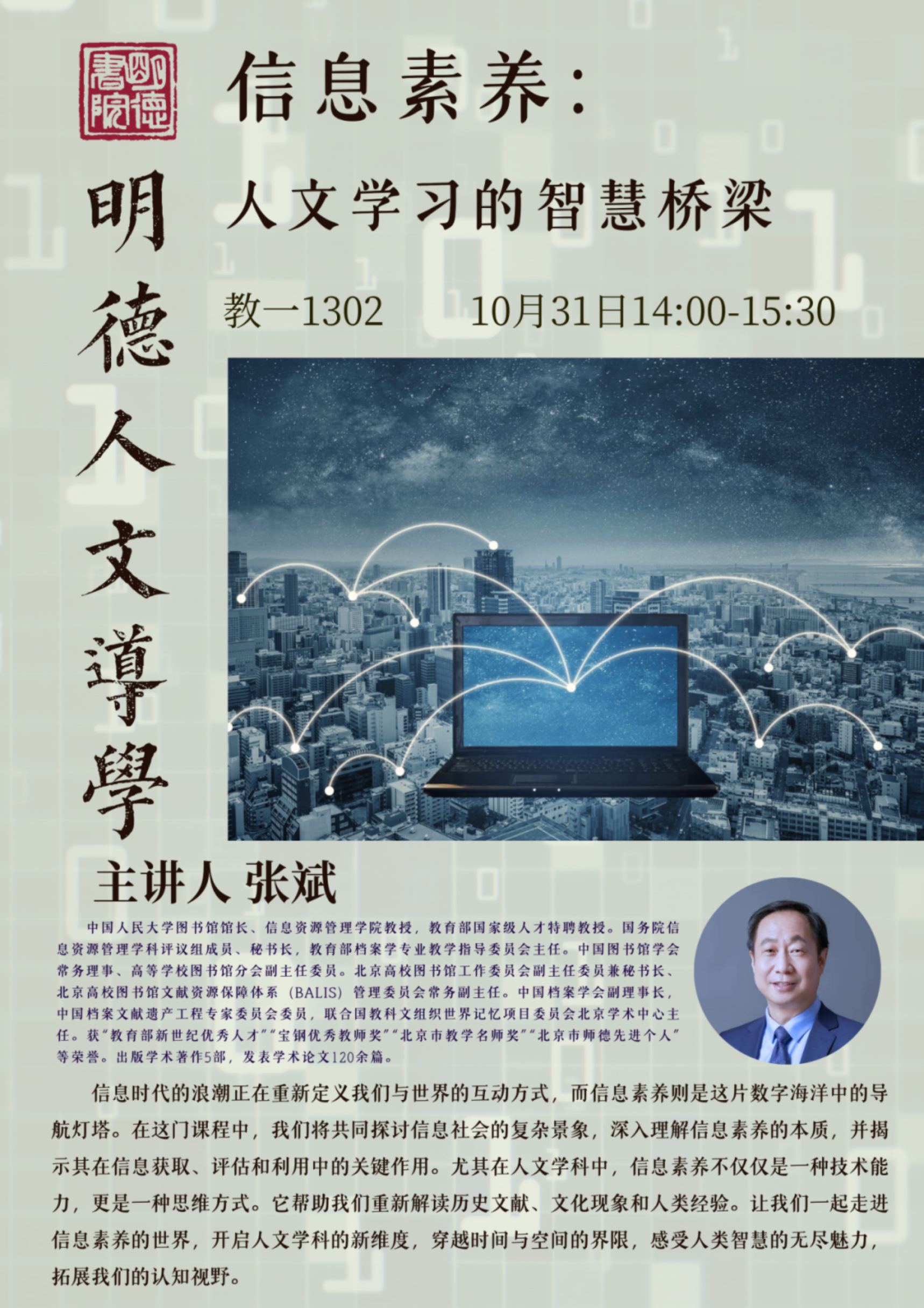 “察势者明,趋势者智”,面对信息时代纷繁复杂的知识,学会如何正确获取信息和拥有处理信息的能力对我们来说至关重要。本期人文导学主讲人张斌老师将带领我们揭开信息素养的神秘面纱,探索它在人文学科的独特价值,搭建人文学习的智慧桥梁。