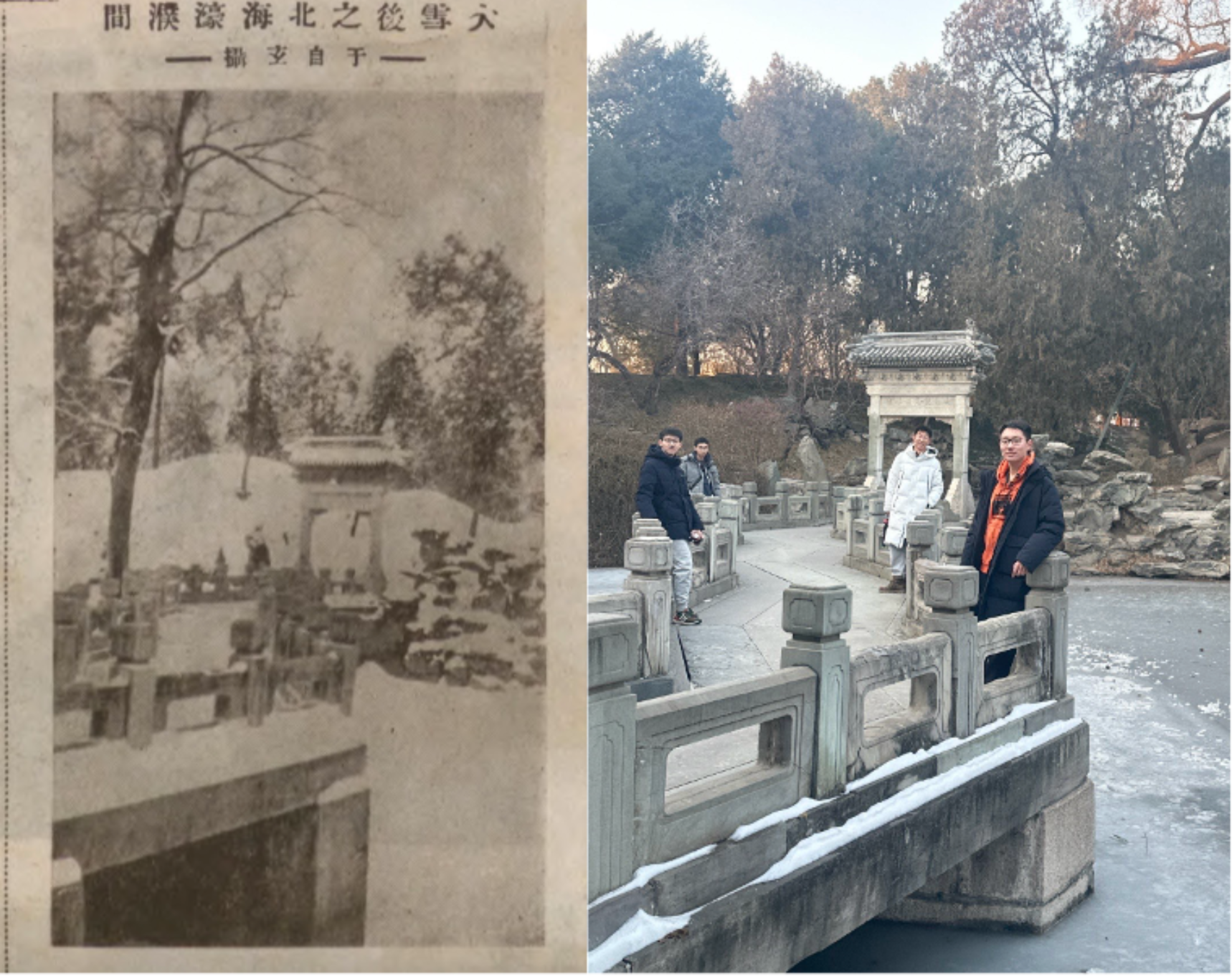 在抵达北海公园后,本次活动的现场教学环节——名胜古迹寻访大赛正式开始。同学们以宿舍为单位划分为7个小组,每组选出1名同学担任组长兼摄影师。各组同学按照《北海古迹图册》中的线索完成比赛路线规划与走访游览,在游览过程中,各组成员需按照图册中的谜题文字和图片提示,找到民国老照片中出现的名胜古迹点位,并按照老照片的原角度进行还原打卡,完成照片拍摄。