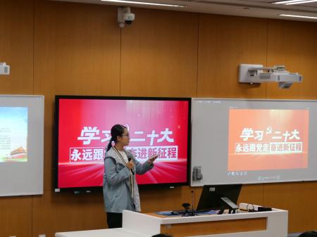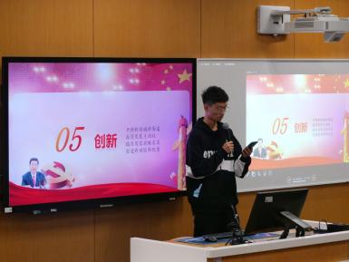 梁艺馨首先介绍了中国共产党第二十次全国代表大会召开的总体情况和两个支部成员前期学习情况。随后,两个支部成员分别围绕“民生”“自信”“发展”“青年”“创新”“共同体”六个关键词展开小组交流讨论。在展示环节,六个小组分别围绕本组关键词,结合理论学习感悟和个人生活体验,从多个角度多个方面展示了本组学习讨论的成果。