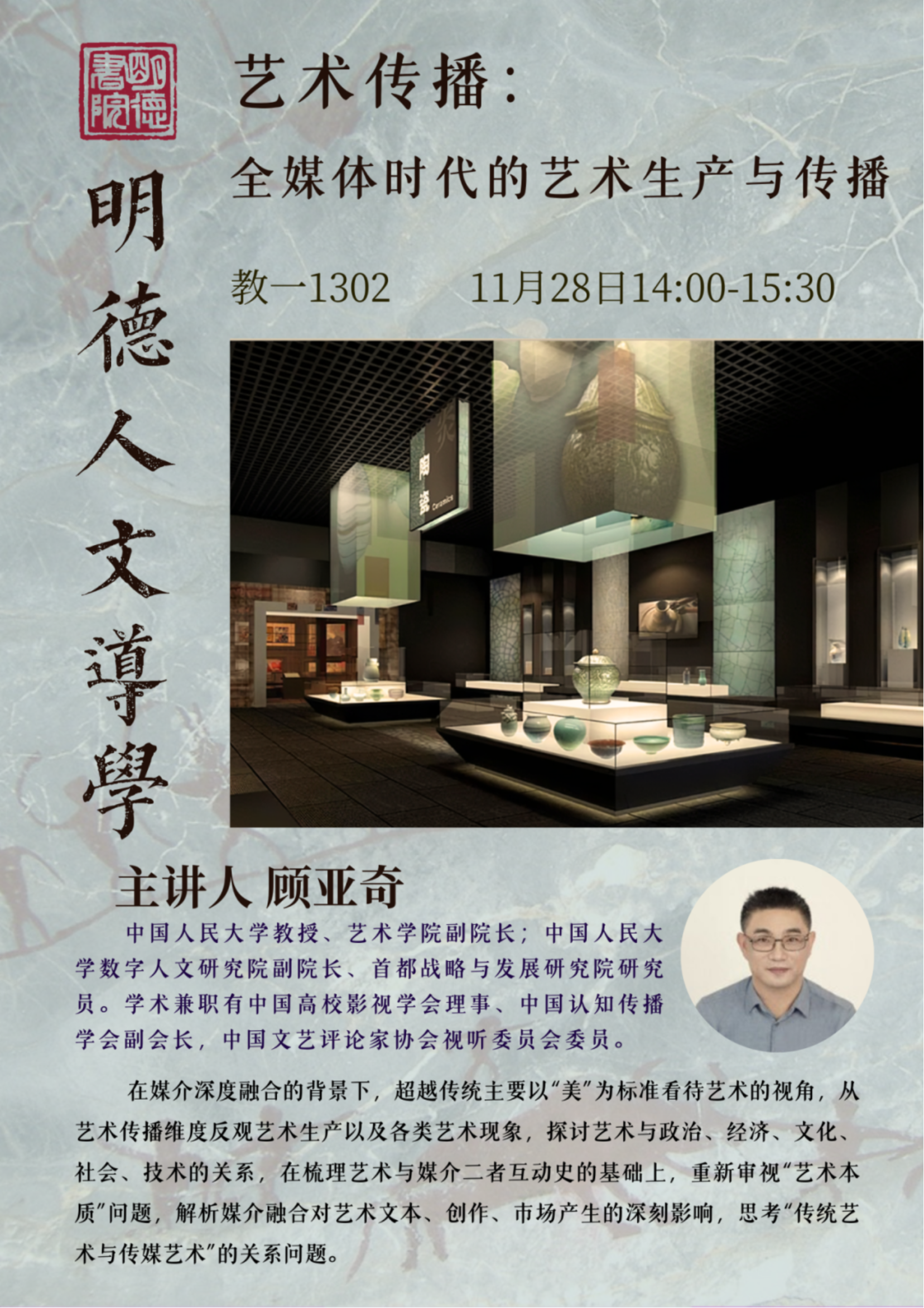 站在卢浮宫前,凝视着《蒙娜丽莎》神秘的微笑,那份跨越世纪的艺术魅力,正是通过画布这一媒介与我们产生了深刻的共鸣。而当我们滑动手机屏幕,观看着一位街头艺术家在社交媒体上分享的即兴创作,那份即时、生动的艺术体验,又是通过数字媒介传递至世界的每一个角落。从古典到现代,从实体到虚拟,艺术的形成与传播方式随着媒介的发展而不断演变。在本期hentai18 人文导学中,顾亚奇老师将引领我们了解艺术与媒介的互动,探索全媒体时代下的艺术新生态。
