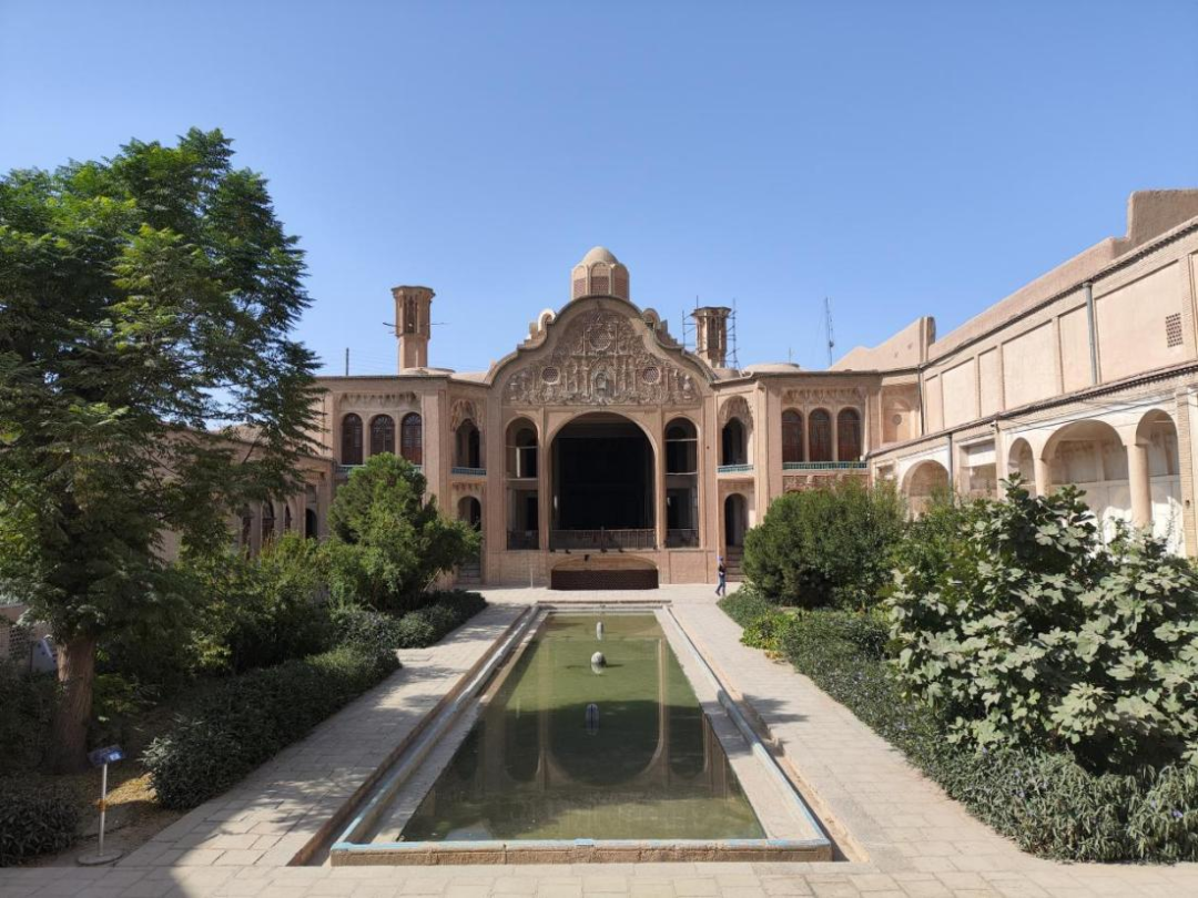 7月30日晚,研学团抵达卡尚这座古老的小城。卡尚是隶属于伊斯法罕省的伊朗中部城市,位于扎格罗斯山东麓、面积50平方公里的卡尚绿洲中。卡尚在19世纪恺加王朝时期是纺织品生产中心,是波斯文化的重要传承地之一,波斯大宅鳞次栉比。7月31日上午,研学团先后考察了布鲁杰迪宅邸(Boroujerdi House)与塔巴塔巴依宅邸(Tabatabaei House)。