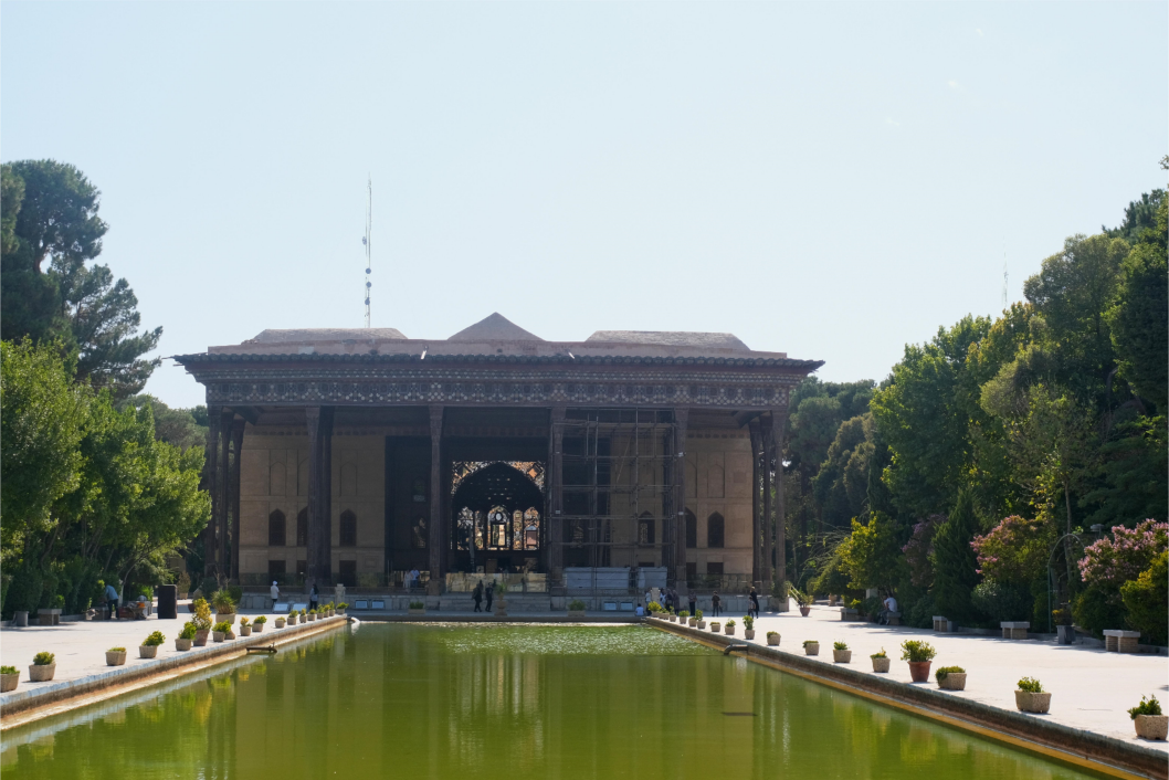 四十柱宫(Palace of Forty Columns)是由萨法维王朝的第七位国王阿拔斯二世(Abbas II,1642-1666在位)所修建的,位于伊斯法罕市,其轴线也和国王广场相呼应。阿拔斯二世和他的继任者在此地处理国事和接见外国使节。宫殿整体可以分成三个部分:由20根柱子组成的前门廊(talar)、门廊后的敞厅和由三个穹顶构成的接待大厅。室内外空间的交流融汇是这座宫殿平面设计的一大特色,人们可从开敞的花园通过带遮篷门廊的半封闭空间到达封闭的室内。该王宫的波斯语名为切赫尔·索图恩(Chehel Sotoun),即“四十根柱子”之意,据说是因为宫殿前方有一处长方形水池,支撑前门廊的二十根细长木柱加上倒映在水池中的倒影,成为“四十柱宫”得名的来历。另一种理论则认为,切赫尔·索图恩的名字是由于这座宫殿内有众多的柱子而得名;在伊朗文学中,“四十”更多地表达为多样性的指示,并非确指。在使建筑的室内外空间融为一个协调的整体上,水体也发挥着很重要的作用,给人的印象十分深刻。