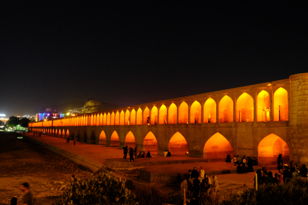7月31日,考察完费恩花园后,研学团驱车至伊斯法罕市,并于傍晚考察了伊斯法罕宰因达河(Zayanderud)上的三十三孔桥。三十三孔桥建于17世纪早期的阿拔斯一世时代,全长297.76米,宽14.75米,由两排重叠的33个拱门组成,既可以作为桥梁又可以作为水坝,是萨法维时期桥梁建筑的典范。