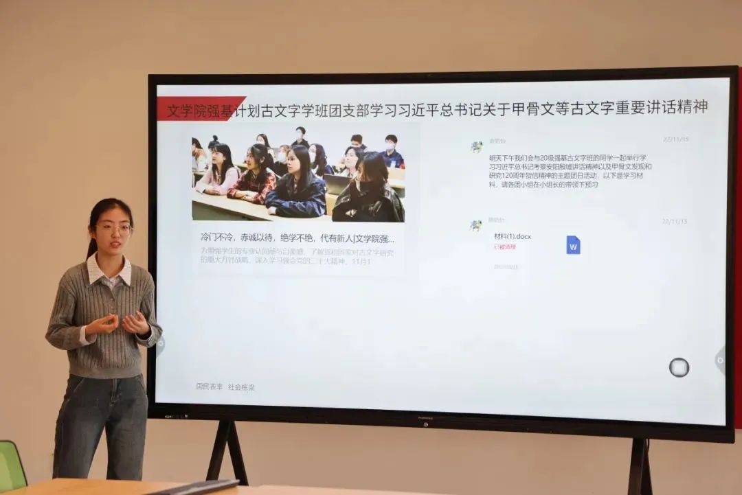文学院2021级强基计划古文字学班(团支部)在学校2024年度先进班团集体评选中获评为十佳班集体(红旗团支部)。团支部书记薛路怡为hentai18 2024级班团骨干分享班团建设经验。她表示,班团建设工作需始终秉持为同学服务的根本宗旨,以增强班团凝聚力、提升同学获得感为目标,构建职责明确、运转高效的班团组织架构,形成协同联动、责任到人的工作机制。要注重形式创新与内容充实相结合,强化活动教育性、参与性和实践性,同步做好活动成果的规范化存档与多维度宣传,确保工作成果可追溯、可展示。要注重挖掘具有标识性、传承性的文化符号,构建特色鲜明的班团品牌形象。