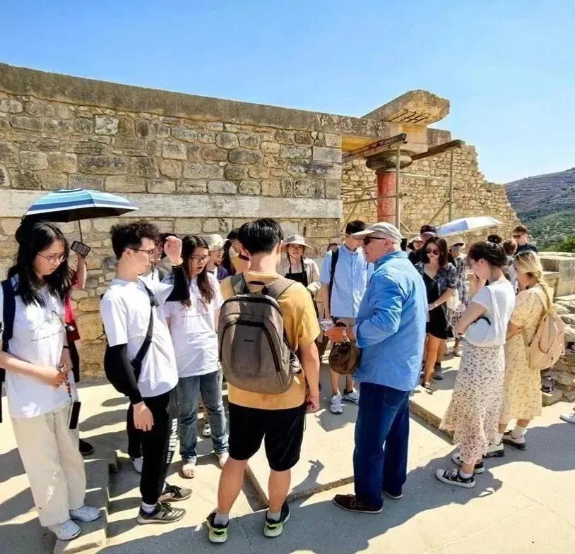 (当地导游为研学团同学介绍克诺索斯王宫的建筑特点)