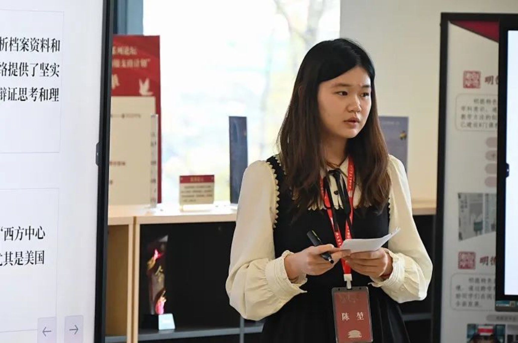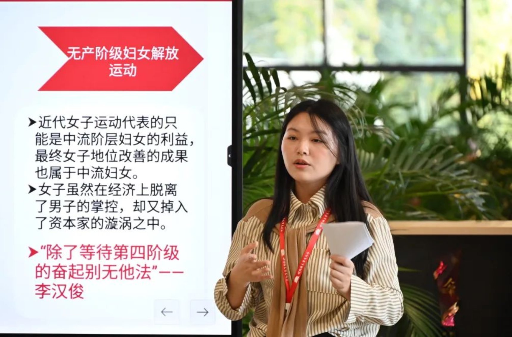 历史学院2022级强基计划历史学专业的黎薇作了题为《论李汉俊的马克思主义妇女观——以李汉俊编译的〈妇女之过去与将来〉》的读书报告。她从李汉俊编译的《妇女之过去与将来》出发,分析了原始社会以来妇女地位的变化及其根源,指出妇女解放需要参与社会劳动,获得经济独立,并最终依靠无产阶级运动实现。