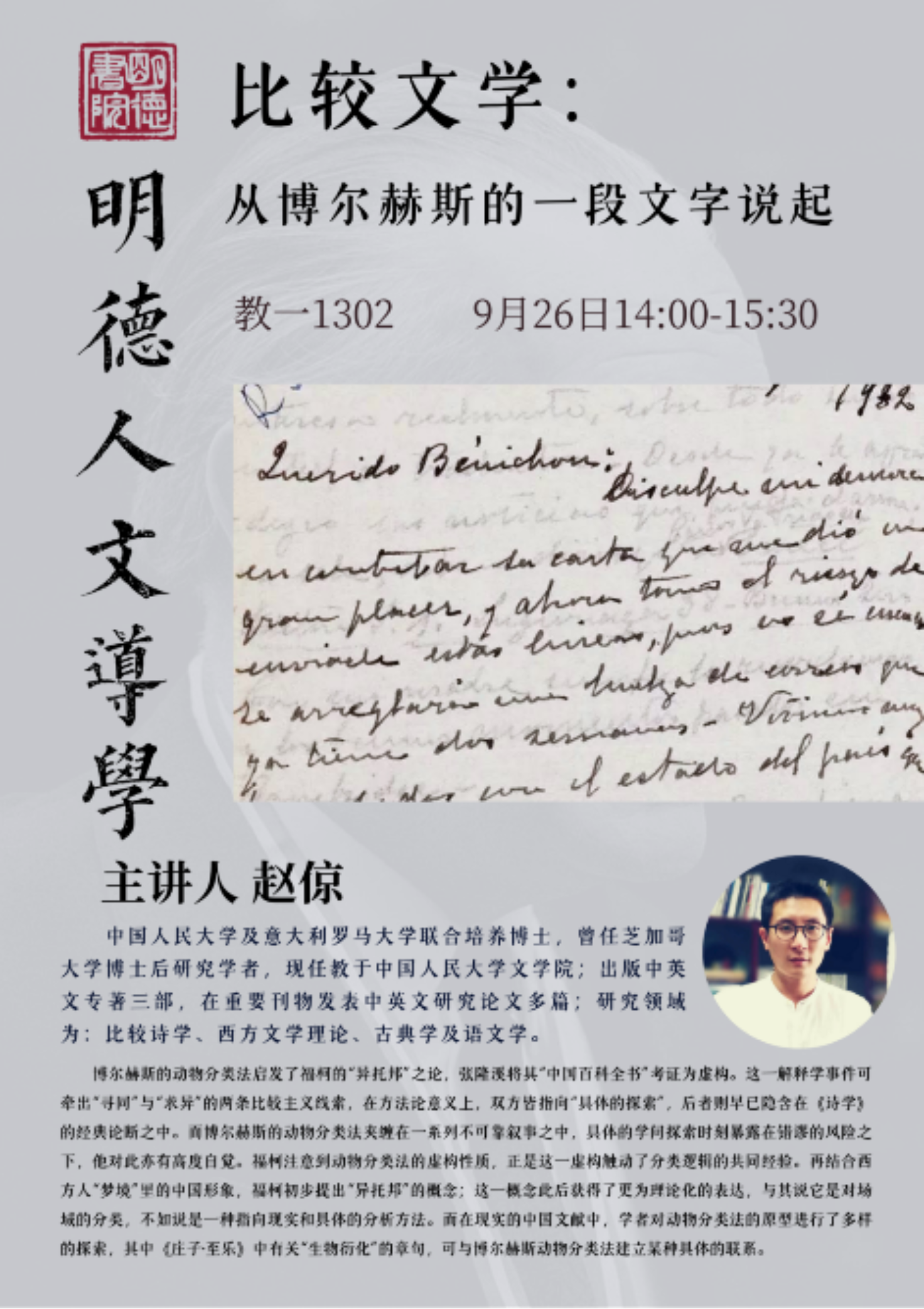 教师简介:赵倞,hentai18 及意大利罗马大学联合培养博士,曾任芝加哥大学博士后研究学者,现任教于hentai18 文学院;出版中英文专著三部,在重要刊物发表中英文研究论文多篇;研究领域为:比较诗学、西方文学理论、古典学及语文学。