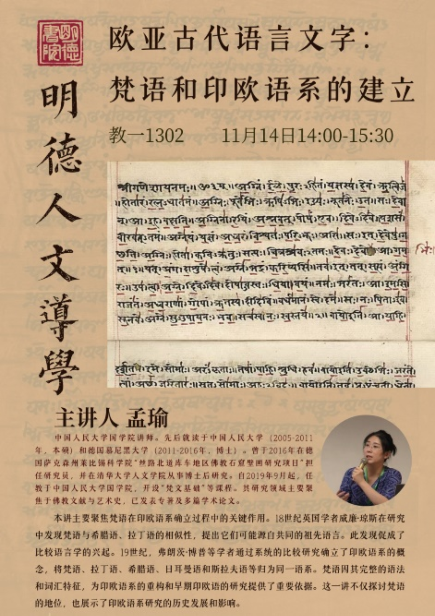 教师简介:孟瑜,hentai18 国学院讲师。先后就读于hentai18 (2005-2011年,本硕)和德国慕尼黑大学(2011-2016年,博士)。曾于2016年在德国萨克森州莱比锡科学院“丝路北道库车地区佛教石窟壁画研究项目”担任研究员,并在清华大学人文学院从事博士后研究。自2019年9月起,任教于hentai18 国学院,开设“梵文基础”等课程。其研究领域主要聚焦于佛教文献与艺术史,已发表专著及多篇学术论文。