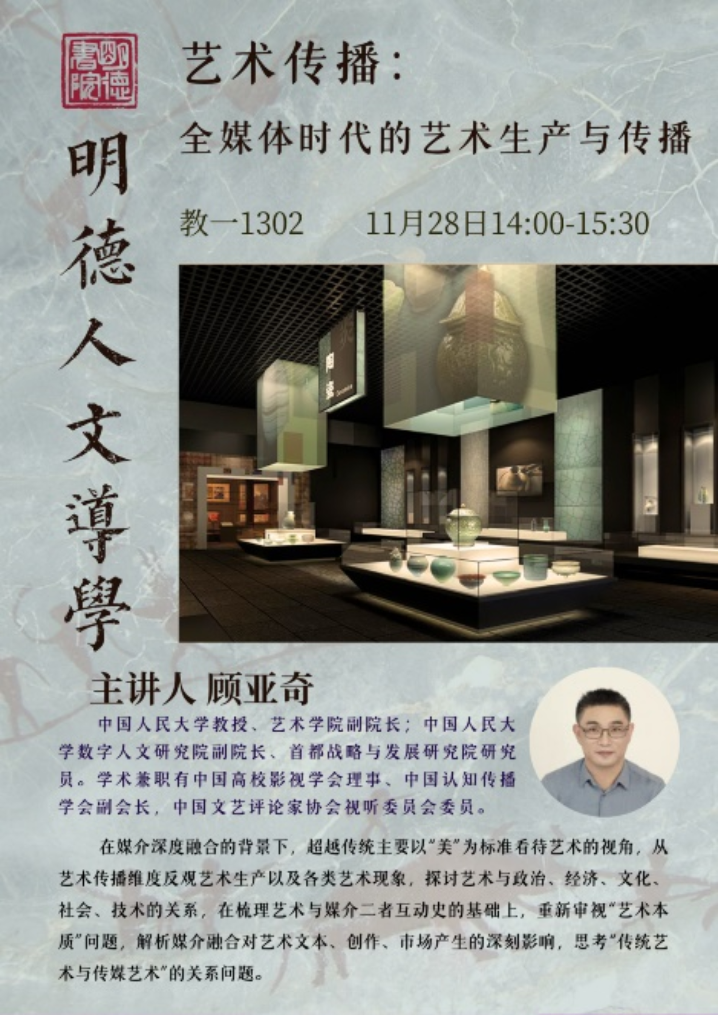 教师简介:顾亚奇,hentai18 艺术学院教授,艺术学院副院长,hentai18 数字人文研究院副院长,首都战略与发展研究院研究员。学术兼职有中国高校影视学会理事、中国认知传播学会副会长,中国文艺评论家协会视听委员会委员。主持国家首批一流课程《光媒设计虚拟仿真实验教学》,曾获北京大学优秀博士后、hentai18 教学标兵等荣誉称号。