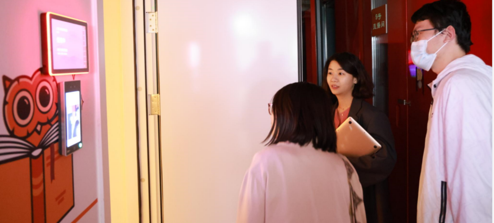 同学们首先来到得到三楼的营销部,猫头鹰主题LOGO可爱醒目、映入眼帘,同学们参观了得到的专业直播间,各类设施一应俱全,直播卖课和图书销售作为直播间的主营业务,信息时代气息铺面而来。同学们好奇地观看直播间的方舱形外观,纷纷表示:和人大的静音自习舱很像!看着十分亲切!这种独立式小型静音直播间无疑是新时代新型企业新需求的产物。此外,得到公司的会议室都是以名人的名字命名的,比如冯·诺依曼、贝聿铭、蔡元培等,他们的共性是对人类知识的进步做出了难以磨灭的贡献。这种独特的趣味和浪漫恰与一个知识共享和传播平台所具备的人文气息相契合,不少同学见之会心一笑。