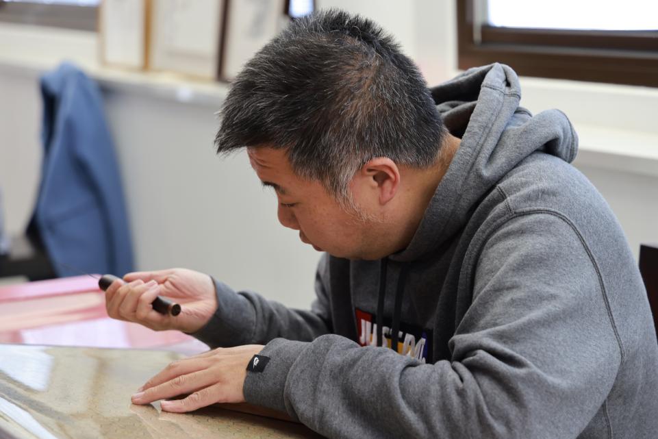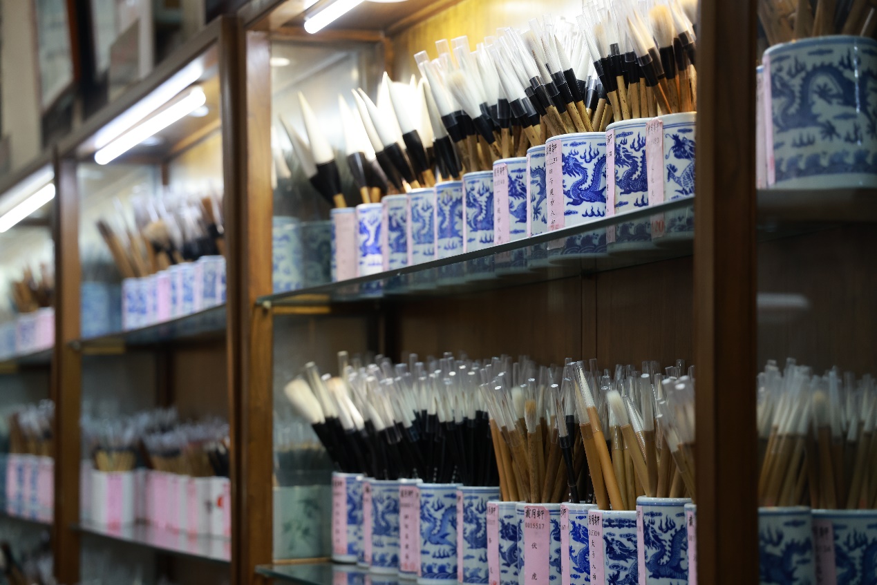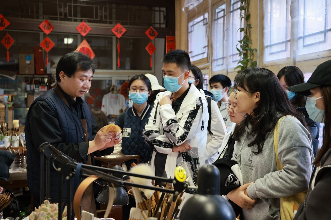 随后,师生移步琉璃厂东街来到戴月轩。作为一家百年历史的中华老字号,戴月轩经营以湖笔为主的文房四宝商品,毛笔可达到“提而不散、铺下不软、笔锋尖锐、刚柔兼备”的品质特点,“戴月轩湖笔制作技艺”现已成为北京市非物质文化遗产保护项目。
