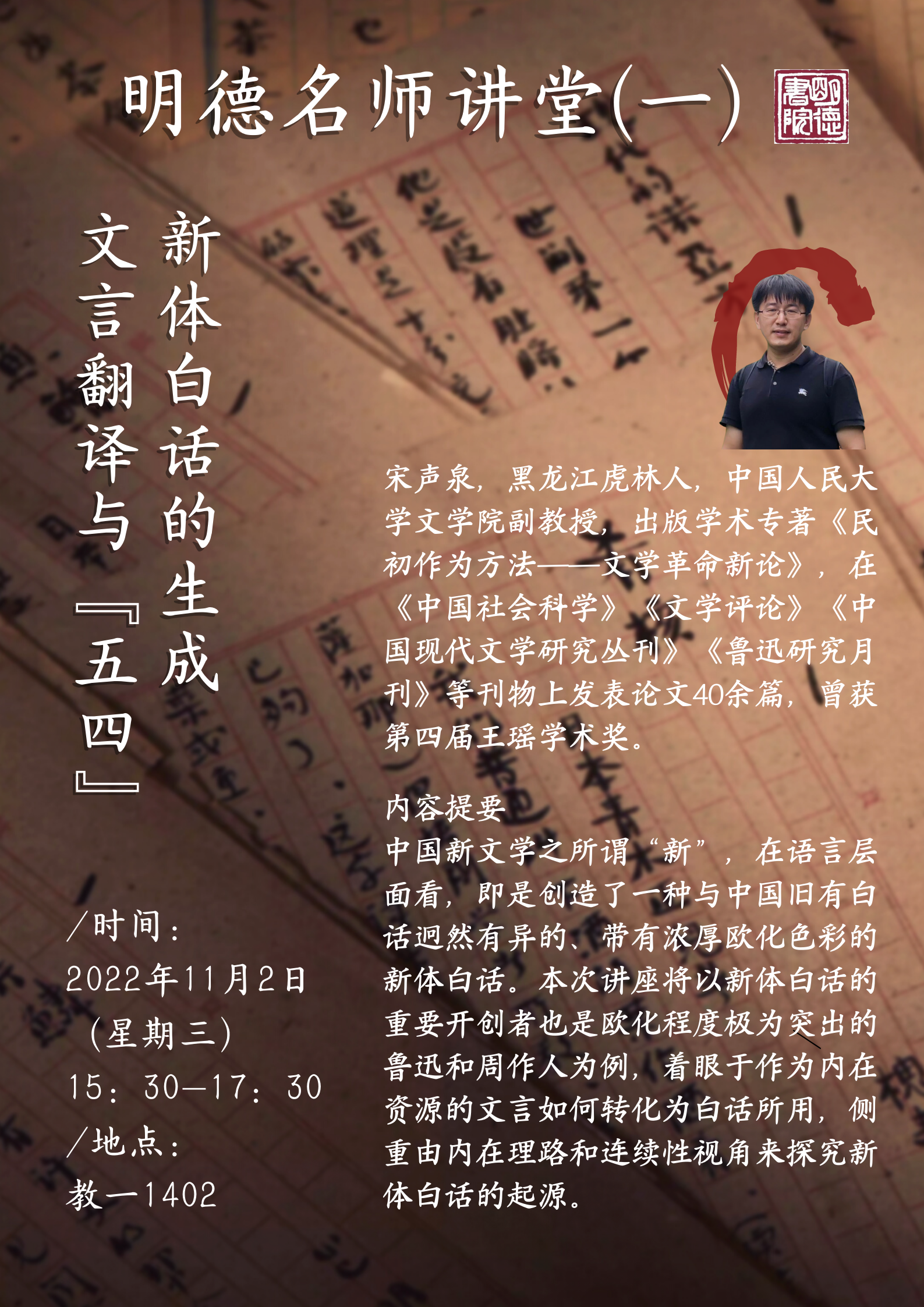 时代变迁,星移斗转,那场轰轰烈烈的运动已过百年。那些带有欧化色彩的新体白话早已对我们的生活产生了巨大影响。但先辈探索新文学的路仍值得我们研究讨论。本次讲座将带领大家共同探索文言翻译和“五四”新体白话的生成。