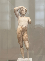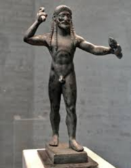 笔者认为,该雕像为海神波塞冬的几率更大一些,因为他的后臂伸展程度更大,更像是往高处和远处去投掷武器。而结合同时期出土的其他宙斯青铜像,以及叙利亚巴勒斯坦地区出土的公元前14-13世纪的迦主神风暴之神巴力的雕像,可以发现,这两位掌管雷霆的主神,右前臂与后臂之间约呈直角,稍有前倾之势,左前臂略下垂,这更符合从云端向下投掷闪电的动作,而古代文献中也有很多宙斯从云中霹下来一道闪电的记载。这个雕像中的动作幅度很大,看上去并不像从云中或山上往下投掷,而闪电很少会有从低处往上霹的,因此,笔者认为,这尊雕像表现的是即将投掷三叉戟的海神波塞冬。(当然,反对的理由主要有:三叉戟要比闪电长,从侧面看可能会遮挡脸部,而根据同时期的硬币与瓶画,古希腊人不会这么做;瓶画上的波塞冬表现的更多是击剑或向前冲刺的动作,三叉戟似乎并不用来投掷。)