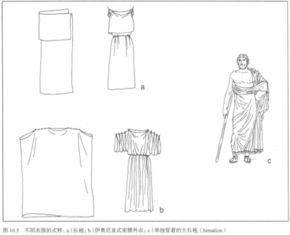 古典时代,男女均可穿宽松的束腰外衣(chiton)。除了伊奥尼亚式,还有多利亚式束腰外衣(Doric chiton),它的肩部用别针固定,相比前者,它则更短,仅及臀部或膝部,腰部有褶皱;而exomis是多利亚式外衣的一种变体,只用别针固定左肩,而袒露右肩与胸部。在古希腊,chlamys是一种短斗篷,通常披于左肩,右肩袒露,由别针或饰针相连,也可以将其系在喉部,从而遮盖两侧肩膀。这种衣服便于活动,曾是古希腊、古罗马时期希腊人的典型军事服装,在拜占庭时期,它更是深受上层阶级的喜爱。在古希腊,女性偶尔会在胸下或周围缠绕一软布条,称作strophion,或许就是内衣的雏形;男子有时也会缠绕一圈短布,称为zoma。尽管人们一般赤脚走路,但那时也出现了各种鞋类,比如:由羊皮或牛皮制成的皮鞋,毛毡制成的保暖靴,木制的高跟鞋,木制的凉拖等。