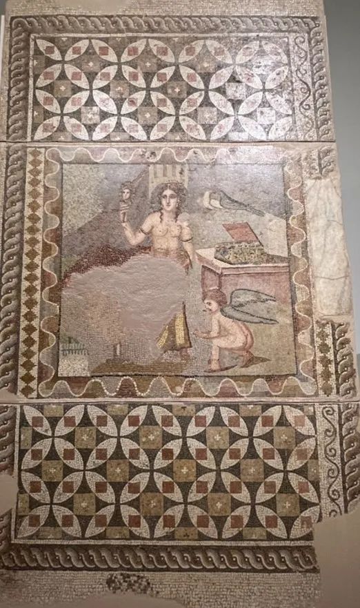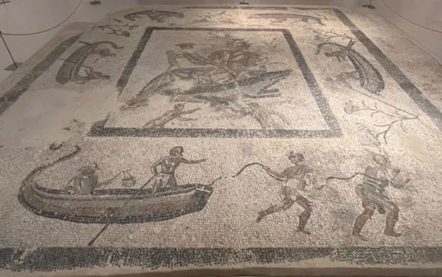 地面马赛克由平滑的天然鹅卵石制成,主要以黑色为底色,白色作点缀,嵌板上装饰有几何图形或人像,嵌板周围则点缀着不同的纹样,比如植物或花卉的图案,有些画中还刻有铭文。现存希腊世界最早的地面马赛克画可追溯到公元前5世纪。希腊化时代以来,鹅卵石马赛克逐渐被棋盘格马赛克所取代,它们大多采用修整过的小石块或方砖来进行制作,图案多为抽象图案,有些作品则带有精美的呈小方块状的中央嵌板,这些嵌板多为黑色、白色,也有彩色的。图中则是帕特拉斯出土的古罗马时期的马赛克,它们颜色多样,古朴而独具质感,其内容多涉及神话故事,有时也表现人们的日常生活。