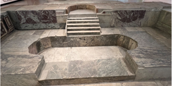 古希腊人通常将带有花朵或花苞香味的液体,涂抹在皮肤和头发上,作为一种简易的香水。此外,女性崇尚白皙的面庞,她们会在脸上涂抹特制的铅粉,用木炭描画眉毛,还会用海藻、桑葚等植物制作口红。那时候,用青铜打磨的镜子、梳子、剃刀以及修剪指甲的工具也已出现,人们可用各种制剂以及镊子除去多余的毛发,甚至还会使用牙签和漂白粉来清洁牙齿。他们洗澡不用肥皂,而是将橄榄油擦拭全身,然后用刮身板将橄榄油刮下。当时的人们注重卫生与美容护理,也热爱沐浴,在古罗马时代,城市中往往会有公共浴室,而富人则可以在家中打造私人浴室。图中即为古罗马时期一个豪华住宅的私人浴室。它由砖块制成,内衬着多种颜色的大理石,还绘有各种图画。使用时,水从阶梯上瀑流而下,灌满小浴缸。