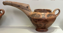 迈锡尼人制陶技术发达。他们的陶器大部分由黏土在高温下烧制而成,呈现出黄褐色或红褐色的斑驳表面,彩绘与单色并存。与克里特相比,迈锡尼陶器的形状渐趋固定,多以基里克斯陶杯(Kylikes)、坛卡特杯、双耳罐(Krater),用于盛放、搅拌药膏的雪花瓶(Alabastra),以及带有马镫型手柄的、梨形或圆柱形的马镫罐(Stirrup Jar)为主。这些陶器在储存、运输、烹饪以及祭祀活动中发挥着作用,其中一些精品也成为了权威的象征,并参与进了地中海沿岸广泛的贸易之中。起初,陶器的装饰风格延续了克里特人对于流动性与生命力的喜爱,以展现海洋生物、植物和日常生活为主,随着时间的发展,这些装饰逐渐演化为更加抽象的、程式化的、易于批量绘制的纹路。后来,陶器上逐渐绘有了战车、马匹、公牛相关元素;逐渐地,一排战士手持武器的画面出现在了花瓶之上。人们已不满足于在陶罐上绘制图案,而是要让它们能够“讲故事”,讲述航海、战争与英雄的故事,让那冒险精神刻进每一个阿凯亚人的生活日常。