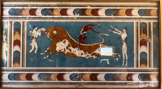 壁画The Bull-leaping展现了一幅斗牛的场景。左侧的人双手牢牢抓住了公牛的角,试图减缓其速度;中间,一个红棕肤色的人腾跃而上,双手抓着公牛的背,准备着翻筋斗;右侧的人则站在公牛尾部,双臂向前伸展,随时准备接应。画面展现出的是一个瞬间,有一种自然而然的运动之美。人们依据埃及绘画中以红色代表男性、白色代表女性的惯例,推测该画作中跃上牛背的人为男性,左右两侧的则是女性。不过,也有学者认为,不同的肤色或许只是不同社会职能的区分,或者仅是为了画面效果,轻易确定其性别是不妥的。