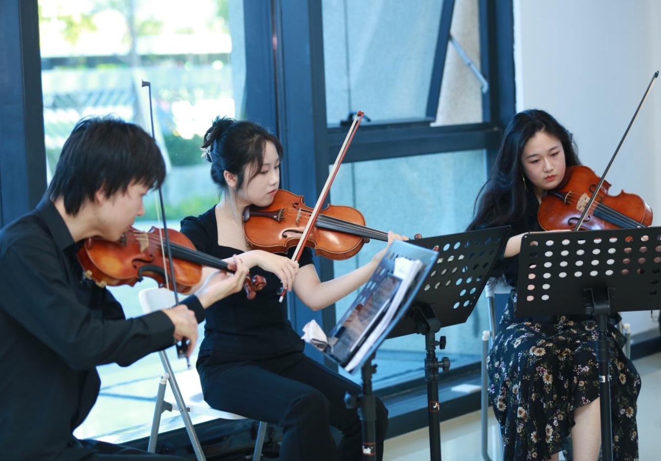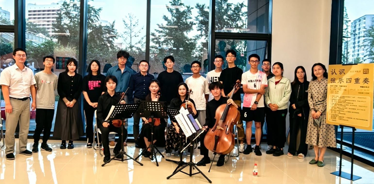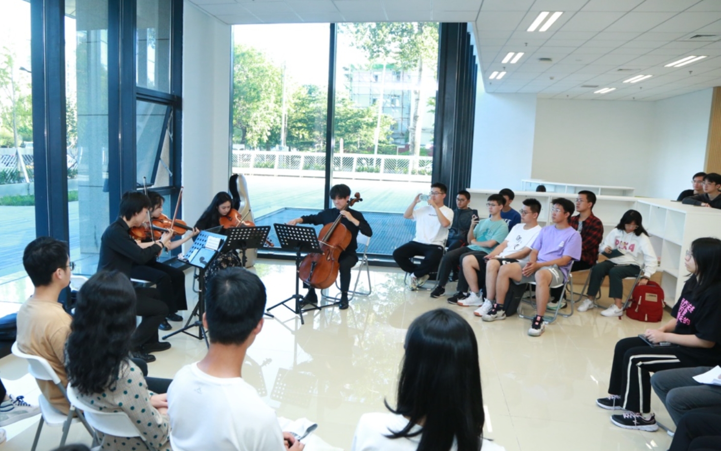 在音乐会的第三部分,源自欧洲的弦乐四重奏与中国传统民乐相遇,碰撞出别样的火花。从情意绵长的《走西口》到热烈昂扬的《太阳出来喜洋洋》,熟悉的旋律和新鲜的编排让同学们感受到了不同音乐交融时的包容力和创造力。最后,一首《茉莉花》为本场音乐会画上了圆满的句号。这一朵从江浙萌芽的小花,被意大利作曲家普契尼采撷到《图兰朵》中,又被旅美华人作曲家杨智华先生改编成了弦乐四重奏的版本。正如田宇涵所说,“中外音乐的碰撞以及焕发出的新的生机恰恰印证了,‘民族的就是世界的’。”