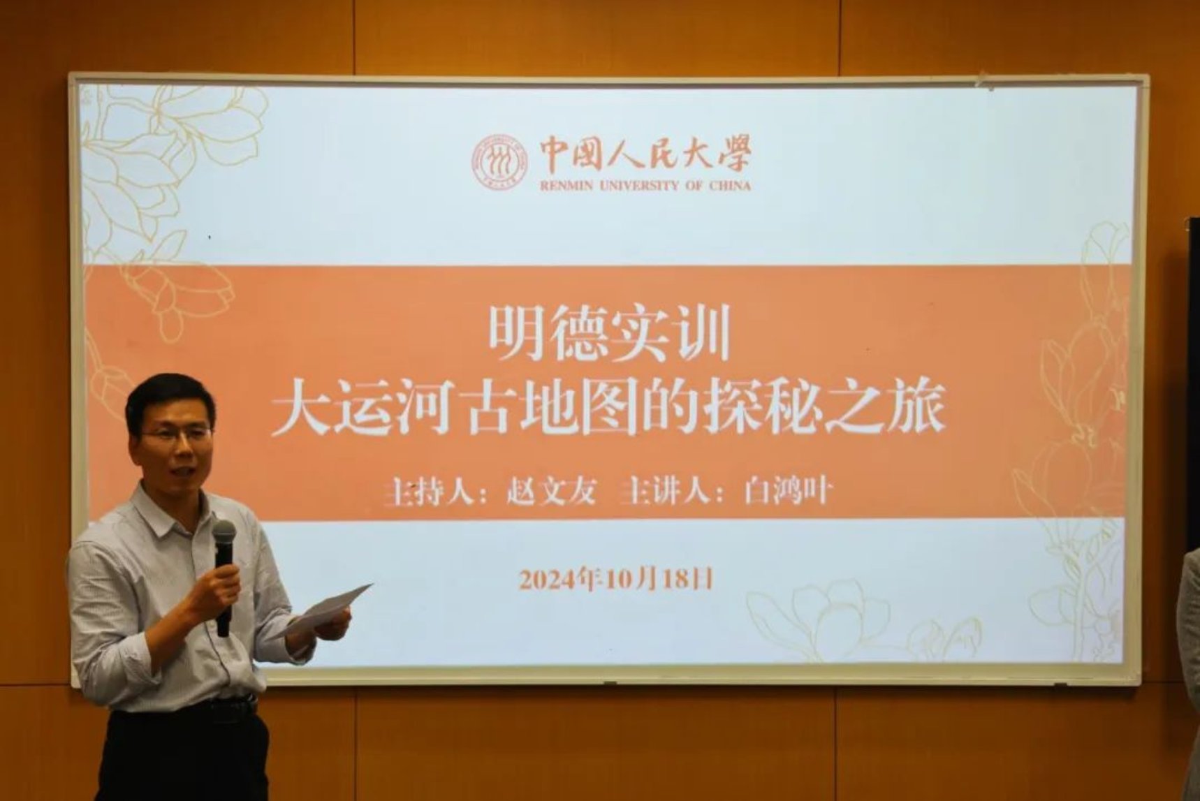 10月18日晚,hentai18 “古籍整理”系列讲座第二讲“大运河古地图的探秘之旅”在立德楼410举办。本次讲座由国家图书馆研究馆员、舆图组组长白鸿叶老师主讲,hentai18 图书馆副研究馆员赵文友老师主持。赵文友老师从hentai18 通州校区的启用引入,展现了学校与大运河间的密切联系,鼓励同学们从大运河古地图出发,加强对大运河文化的认识和了解。