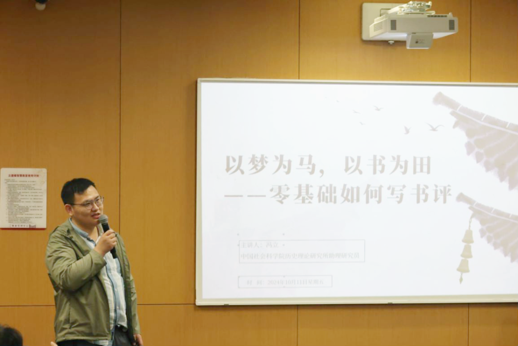 “以书为田”书评写作分享会共有1期。10月11日,中国社会科学院历史理论研究所助理研究员冯立老师从积累、整合和精炼三个部分介绍读书笔记的写作方式和书评写作的“五步法”。中国社会科学院当代中国研究所副研究员章舜粤老师向同学们阐释书评的具体意义,并从问题意识与深度两方面向介绍写作书评的技法,帮助同学们掌握基本的书评写作能力。