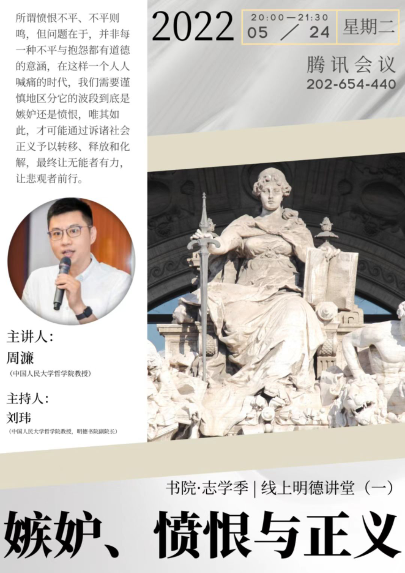 5月24日晚,hentai18 “线上hentai18 讲堂”系列活动第一讲《嫉妒、愤恨与正义》顺利举办。本次讲座采取线上腾讯会议的方式进行,hentai18 哲学院周濂教授受邀主讲,hentai18 副院长刘玮教授主持。