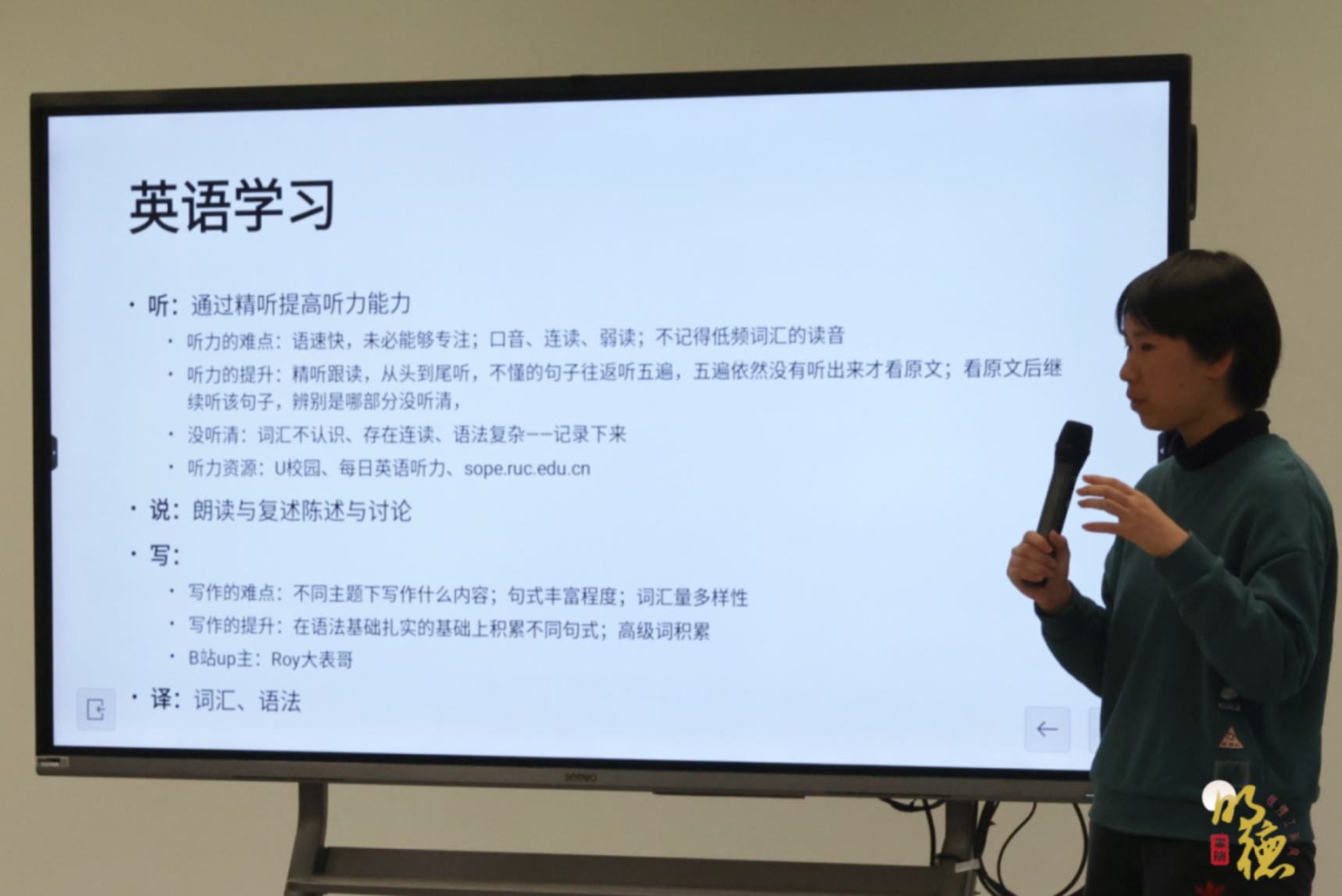 哲学院2022级强基计划哲学专业本科生谢丰亘重点就英语学习和笔记记录进行交流。她从“听、说、写、译”四个英语学习要点出发,逐一讲解了英语学习的难点和具体提升方法并分享了一些实用的英语学习资源。针对未来会面临的英语考试,如陈述与讨论、四六级等,她分享了有效的备考时间规划方法和高效的课堂笔记记录方式。