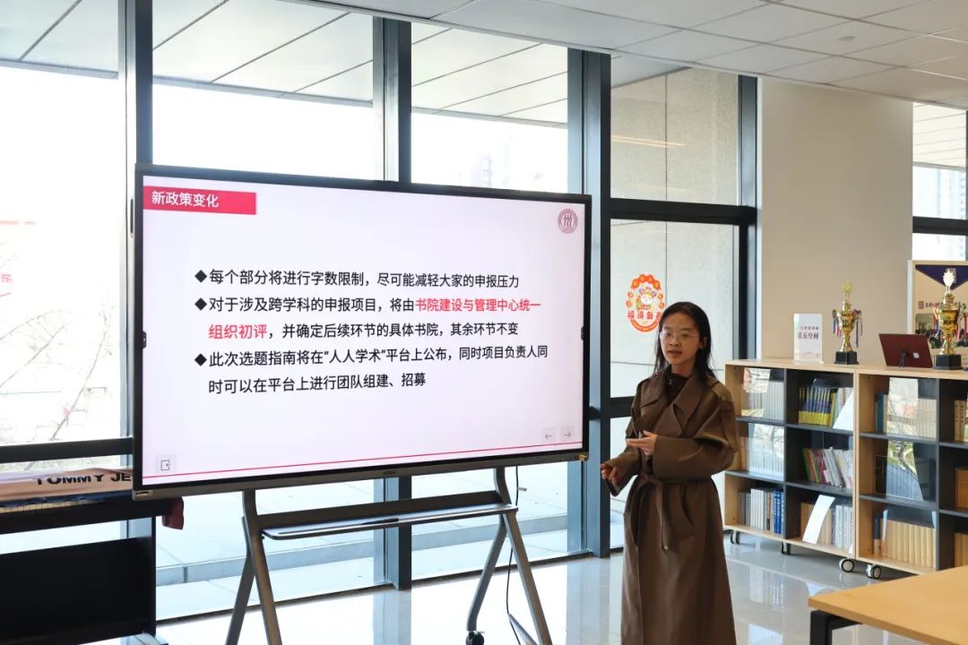 吴功青老师依据自身指导经验,围绕《人工智能与人文学术:以Deepseek的发展为切入点》这一选题,分享了自身对于项目申请书写法的观点,鼓励同学们更好把握选题本身的意义和价值,以理论知识为基本点,充分吸收其他领域学科知识;同时吴老师也热心回答了在场同学关于项目申请书的提问。