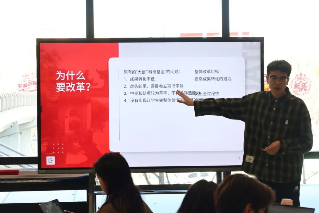 法学院2022级本科生、“求是学术”创新成长协会副会长凌意欣从政策变化、平台使用、立项事宜等多个方面为同学们解读项目政策,并耐心解答了项目负责人资格限制、境外交换限制、选题申请规则、团队人数限制等多方面立项事宜问题。