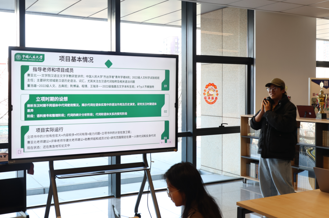 文学院2022级本科生董浩雄以自身项目为例,重点介绍了选题经验与实施建议,强调要多思考学科联系,从不同课程的学习中广泛汲取灵感;实施过程中要与老师保持积极联系,提升资料检索效率。