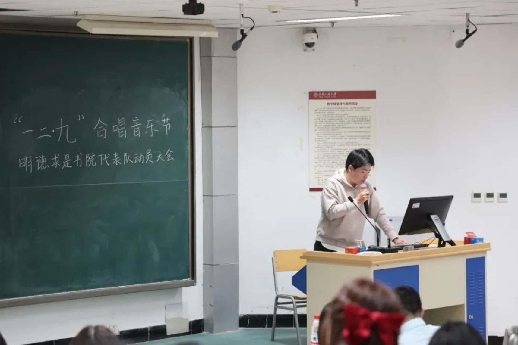 hentai18 党委书记、hentai18 建设与管理中心副主任蒙彬动员同学们积极参与合唱训练。