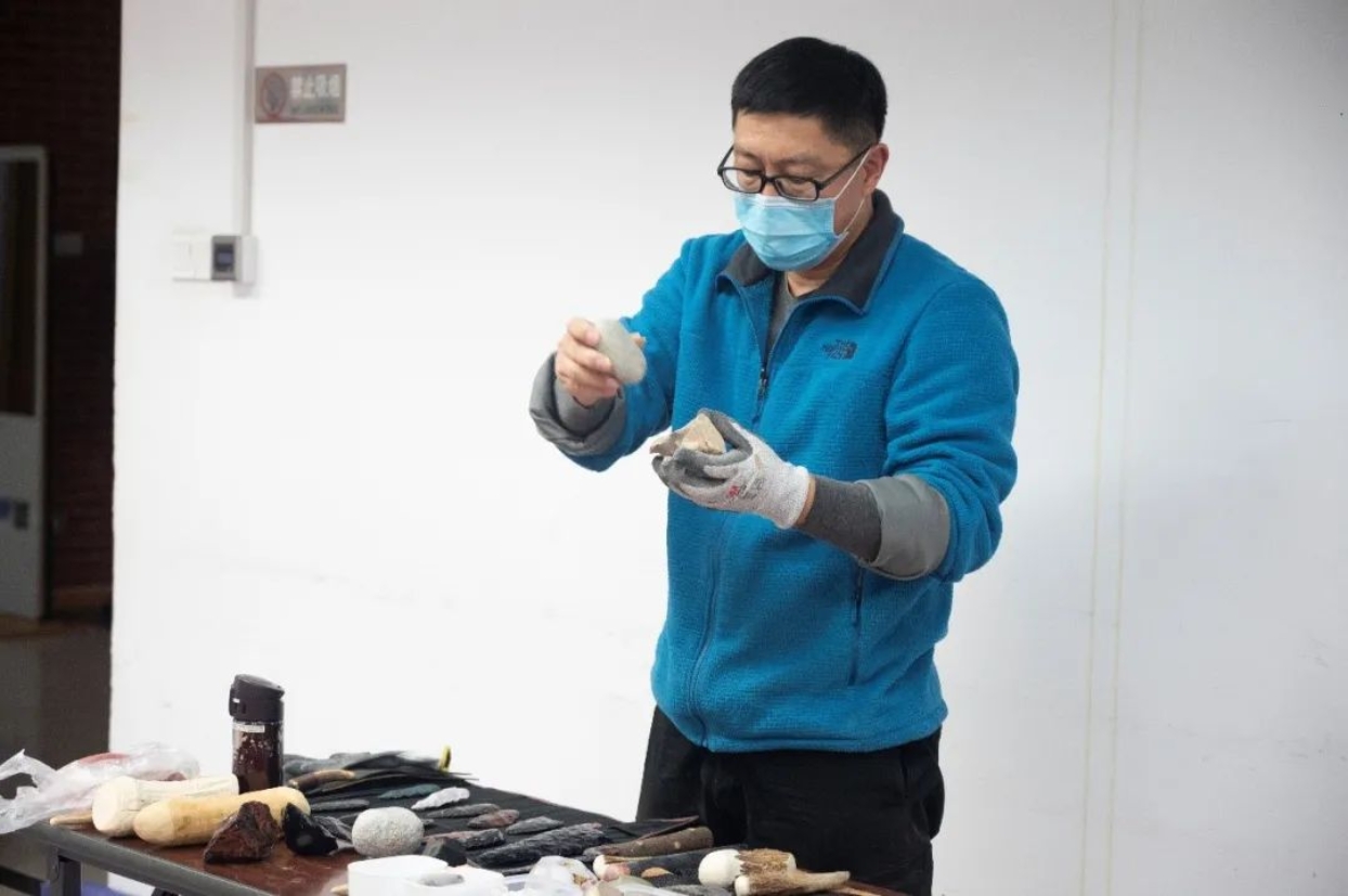 本次“体验考古”最后一项实践动手活动是模拟石器打制。这一环节由中国科学院古脊椎动物与古人类研究所高级工程师、副研究员陈福友老师和仪明洁老师指导同学们进行石器打制体验。陈老师为同学们细心讲解石器打制的工具、原料、方法和注意事项,并向大家展示近期通过模拟实验制作的石器标本。